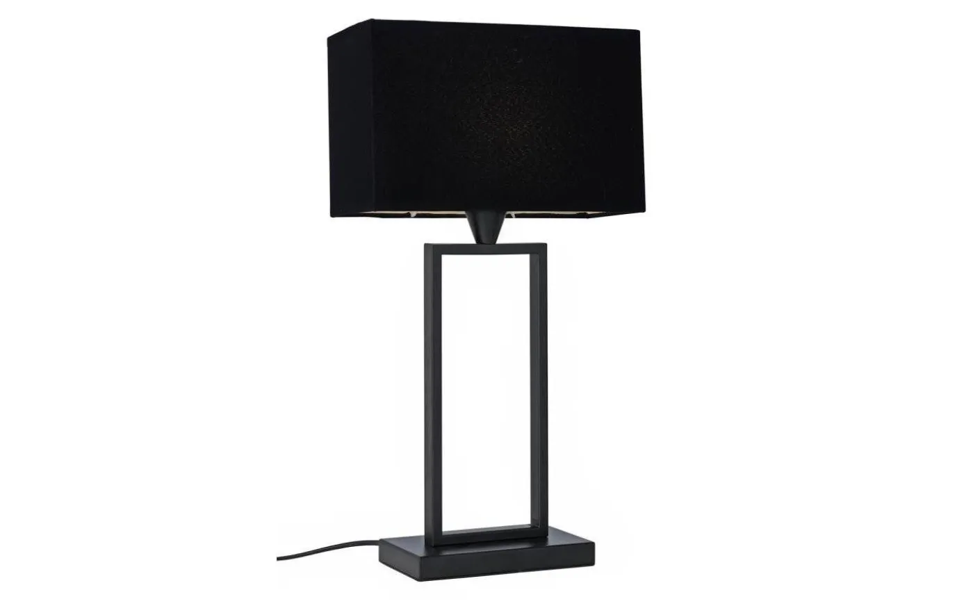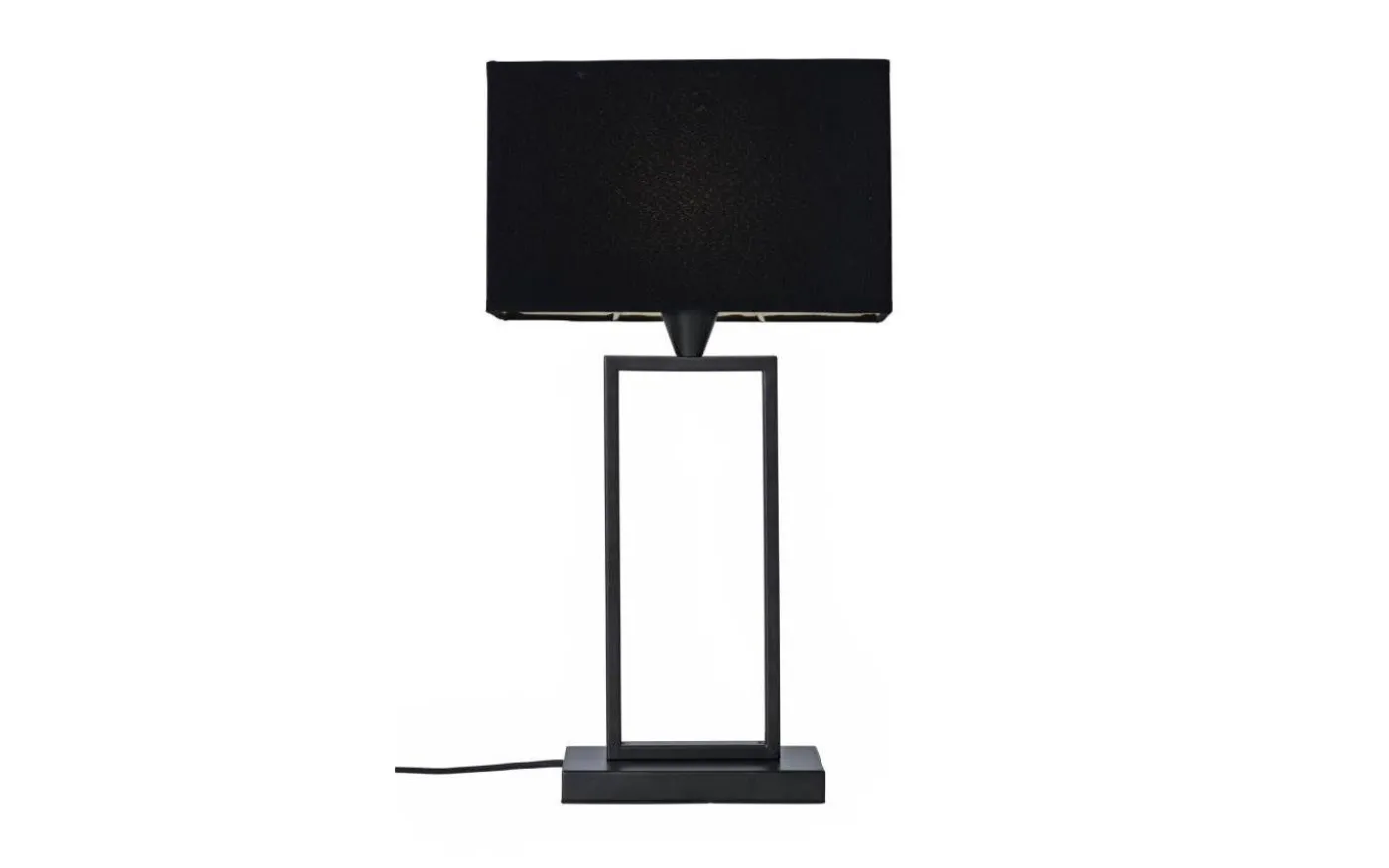 Stilrena bordslampan Kensington, från välkända Cottex, är en elegant bordslampa med fot i svart metall kombinerat med en rektangulär skärm i svart textil.