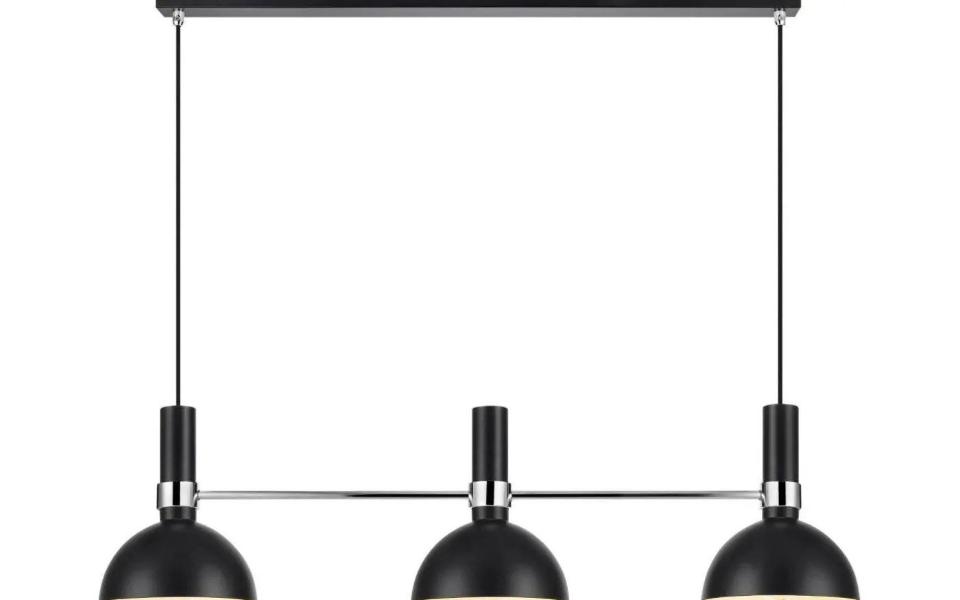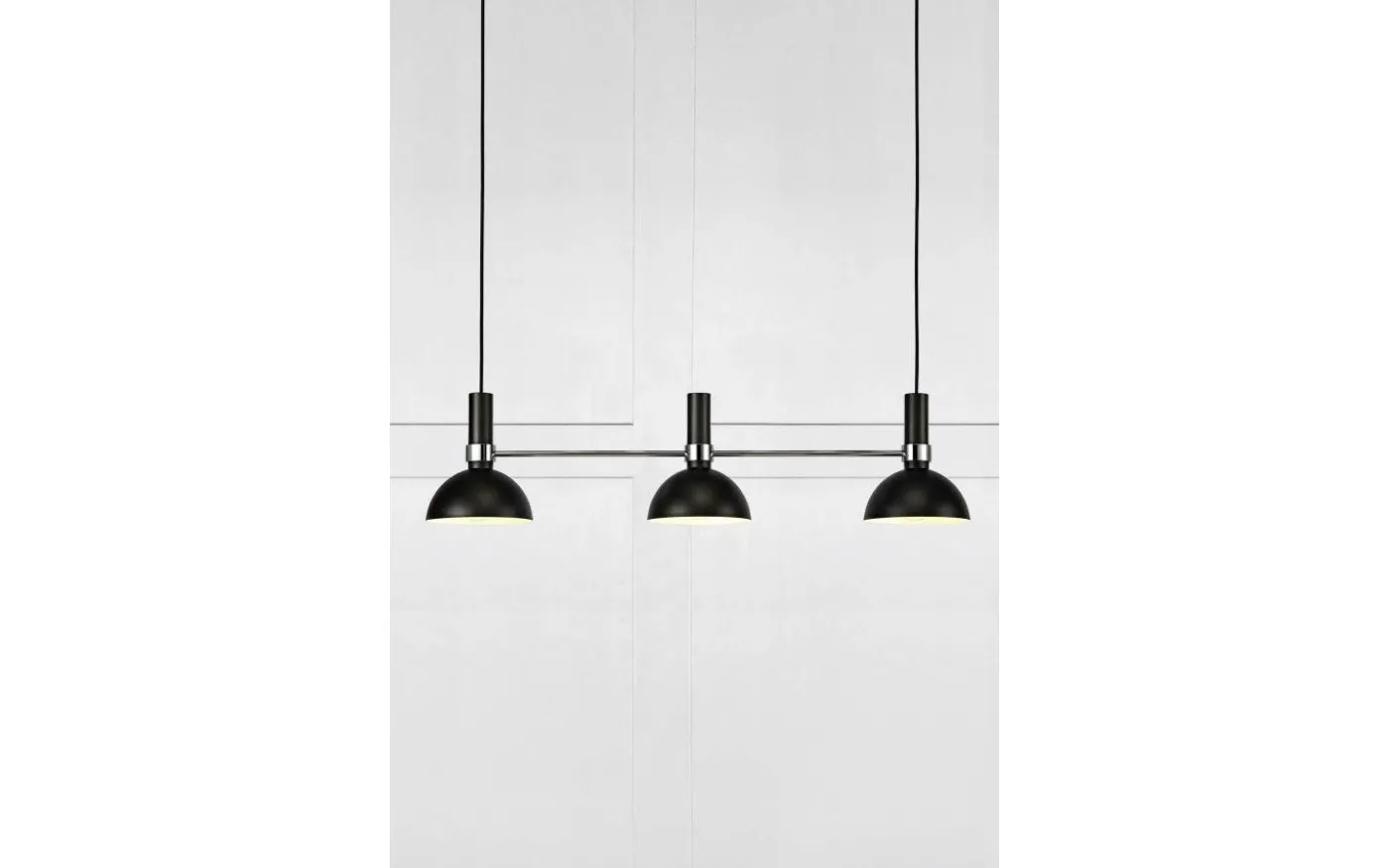 Larry taklampa är designad av Monika Mulder för välkända varumärket Markslöjd. Stommen är gjord av svartlackerad metall med detaljer i krom. Detta är en avlång modell av Larry, med tre lamphuvud, som gör att den passar utmärkt över matbordet eller över köksön. Varje lampskärm har en diameter på 19 cm.