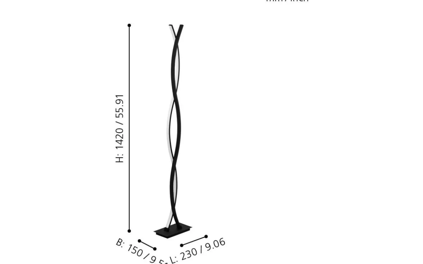 LASANA 3 LED-golvlampan har två böjda LED-profiler av svart metall. De integrerade lysdioderna är gömda under de vita plastkåporna och ger ett behagligt varmvitt ljus. Produkten kan enkelt slås på och av med hjälp av den inbyggda golvbrytaren. Golvlampan smälter sömlöst in i moderna interiörer och ger stilfull belysning i alla utrymmen, oavsett om det är i sovrummet, vardagsrummet eller hallen.