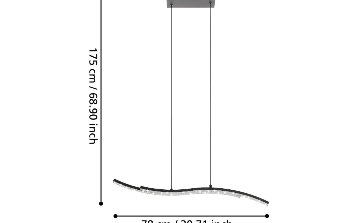 LEJIAS LED-pendellampa är gjord av svart metall och har två upphängda böjda LED-profiler med en dekorativ plastkristallfinish. De integrerade lysdioderna producerar ett behagligt varmvitt ljus och skapar ett gnistrande, exklusivt utseende när ljuset är på. Med sin minimalistiska design och längd på 78 cm fungerar taklampan utmärkt i moderna interiörer. Pendeln ger en elegant, iögonfallande belysningslösning i kök, vardagsrum, sovrum, matsal eller hall.