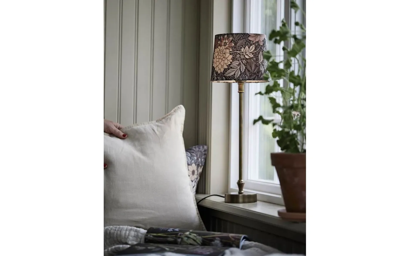 Liam bordslampa från välkända PR Home är en enkel och stilren bordslampa med lampfot i mässing och lampskärm i brun/puderrosa färgställning. Lampskärmen har ett handmålat mönster av designern Jenny Hahne Gadd för Boråstapeter.