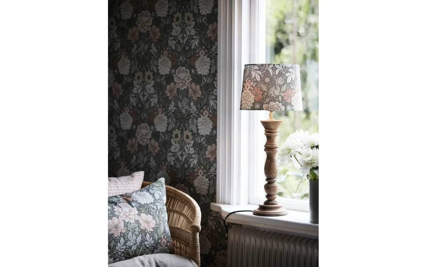 Lodge bordslampa från PR Home är ett paket med Lodge lampfot och Sofia lampskärm i mönstret Dahlia Garden med en grön/mildrosa färgställning.