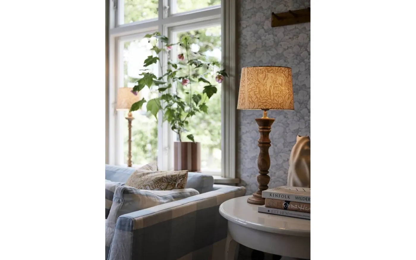 Lodge bordslampa från välkända PR Home är en elegant bordslampa med svarvad träfot och mönstrad lampskärm.