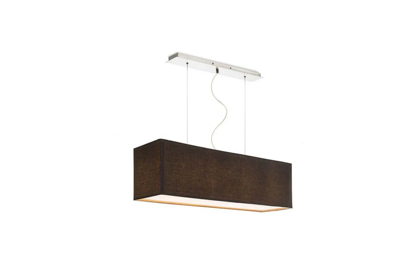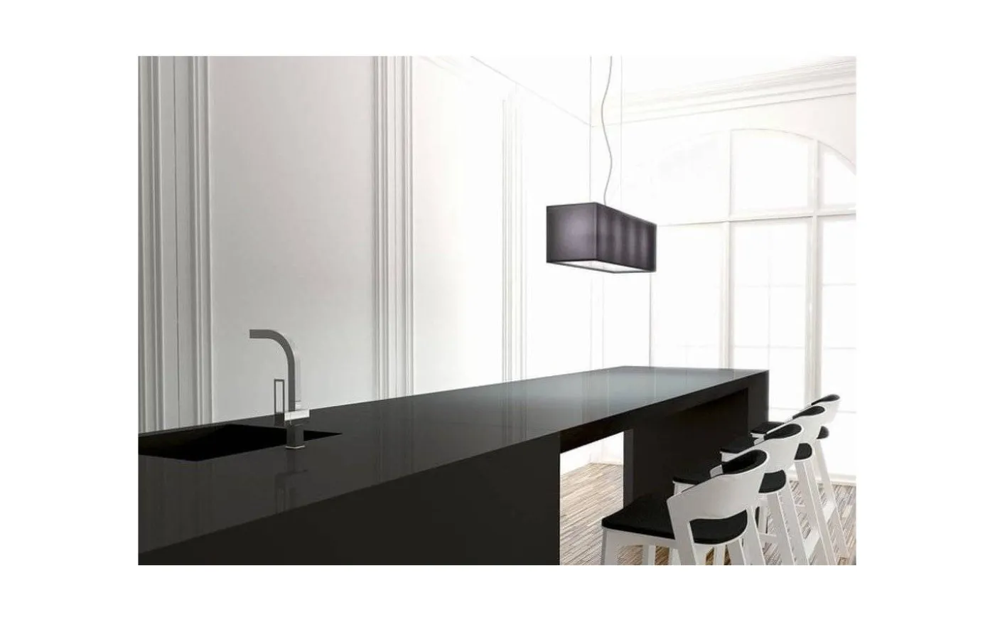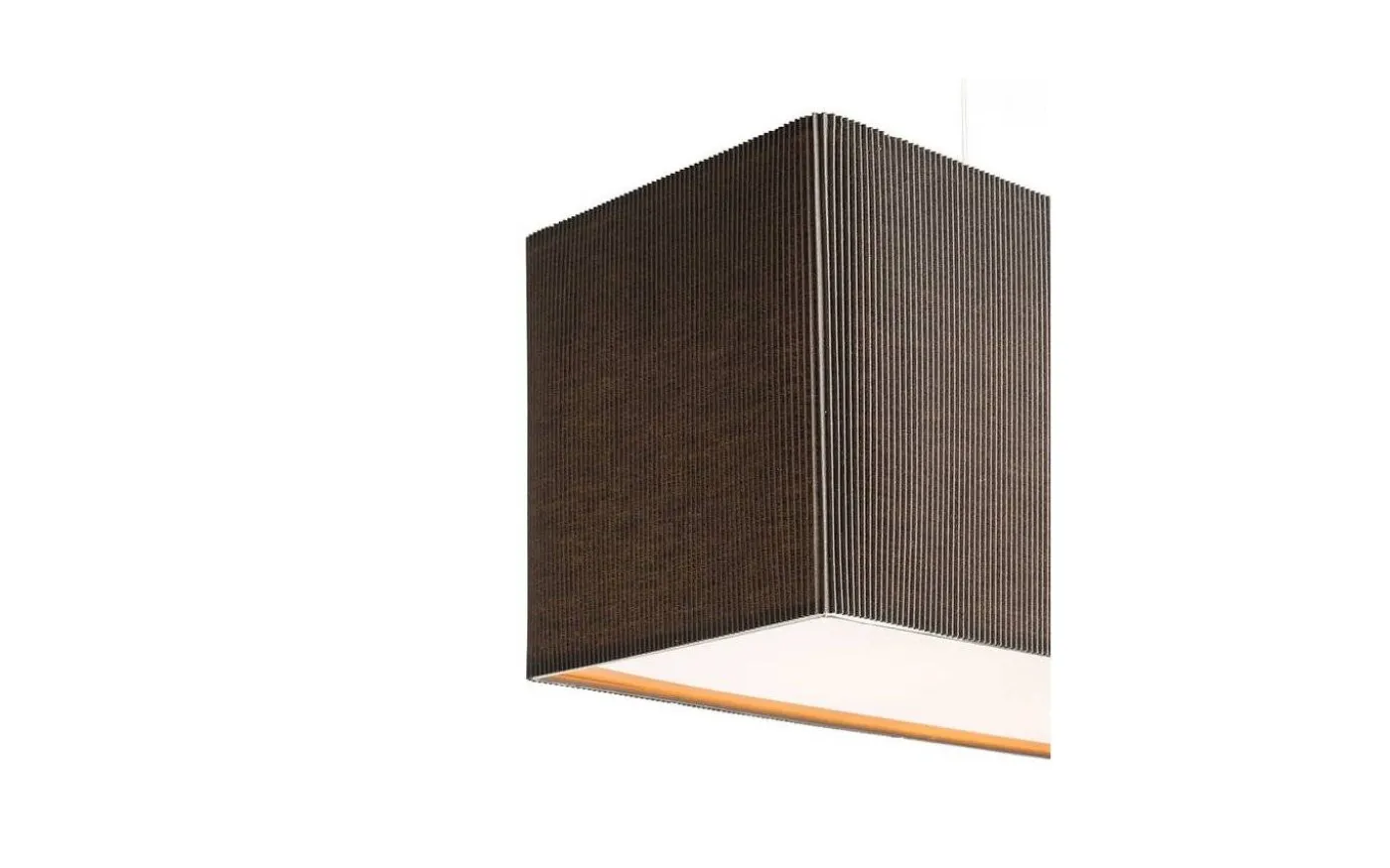 Pendellampa med en finplisserad svart skärm. Armaturen har fyra E27 socklar som är dolda av en diffusor av matt akryl.