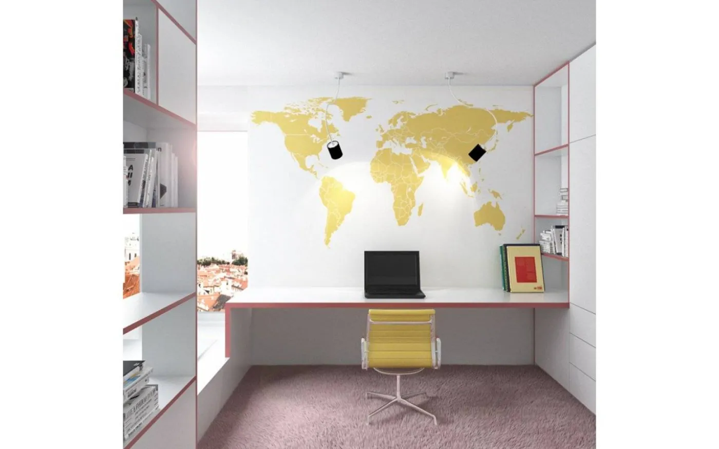Taklampa med LED, textilskärm och en justerbar arm.