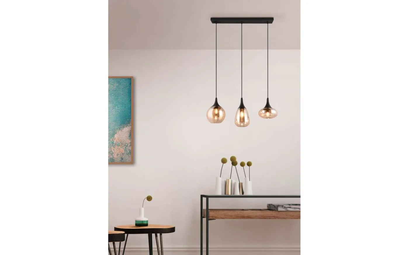 Pendellampan LUMINA är ett särskilt blickfång i ditt vardagsrum tack vare sina eleganta glasskärmar! De tre skärmens olika former och sammansättningen av metall och glas skapar en vacker och unik ljusatmosfär som ger din matplats en modern touch. Tack vare det mattsvarta färgschemat och de bärnstensfärgade glasskärmarna finns det gott om utrymme för andra färger, vilket gör den underbart enkel att integrera i befintliga boendekoncept. För modern och pålitlig belysning rekommenderas användning av en LED-lampa. Den erbjuder hög ljuskvalitet, är mångsidig och övertygar med jämn belysning. Dess långa livslängd och låga värmeutveckling gör den till det perfekta valet för en mängd olika användningsområden. Ljuskälla: exklusiv 3x E14 · max. 40W. Extra information: Justerbar i höjd, Takmontering, IP20, Lampa(or) ingår ej