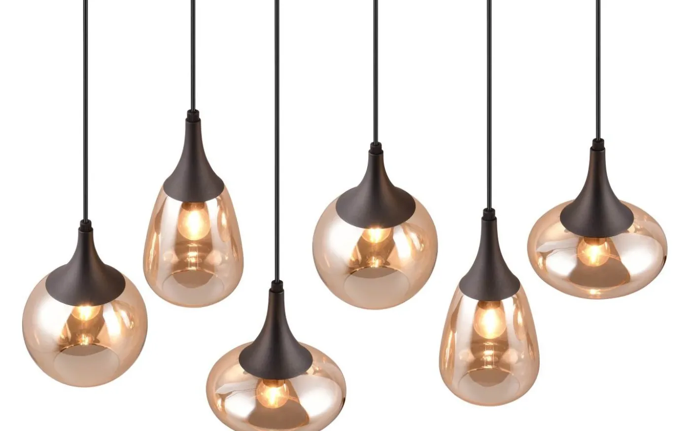 LUMINA pendellampa är ett särskilt blickfång i ditt vardagsrum tack vare sina eleganta glasskärmar! De tre skärmens olika former och sammansättningen av metall och glas skapar en vacker och unik ljusatmosfär som ger din matplats en modern touch. Tack vare det mattsvarta färgschemat och de bärnstensfärgade glasskärmarna finns det gott om utrymme för andra färger, vilket gör den underbart enkel att integrera i befintliga boendekoncept. För modern och pålitlig belysning rekommenderas användning av en LED-lampa. Den erbjuder hög ljuskvalitet, är mångsidig och övertygar med jämn belysning. Dess långa livslängd och låga värmeutveckling gör den till det perfekta valet för en mängd olika användningsområden. Ljuskälla: exklusiv 6x E14 · max. 40W. Extra information: Justerbar i höjd, Takmontering, IP20, Lampa(or) ingår ej