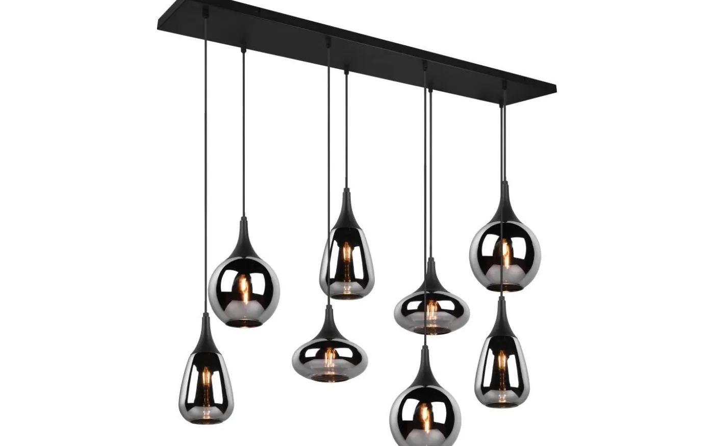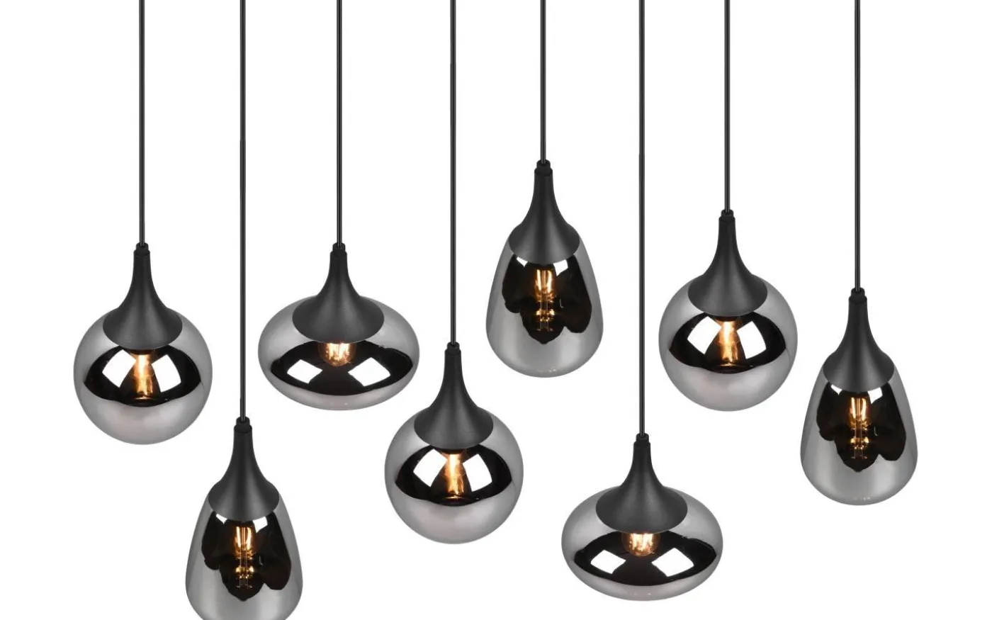 LUMINA pendelarmatur är ett särskilt blickfång i ditt vardagsrum tack vare de eleganta glasskärmarna! De olika formerna på de åtta skärmen och sammansättningen av metall och glas skapar en vacker och unik ljusatmosfär och ger din matplats en modern touch. Tack vare färgdesignen i mattsvart och glasskärmarna i ångad krom finns det gott om utrymme för andra färgnyanser, vilket gör den underbart enkel att integrera i befintliga boendekoncept. För modern och pålitlig belysning rekommenderas användning av en LED-lampa. Den erbjuder hög ljuskvalitet, är mångsidig och övertygar med jämn belysning. Dess långa livslängd och låga värmeutveckling gör den till det perfekta valet för en mängd olika tillämpningar. Ljuskälla: exklusiv 8x E14 · max. 40W. Extra information: Justerbar i höjd, Takmontering, IP20, Lampa(or) ingår ej