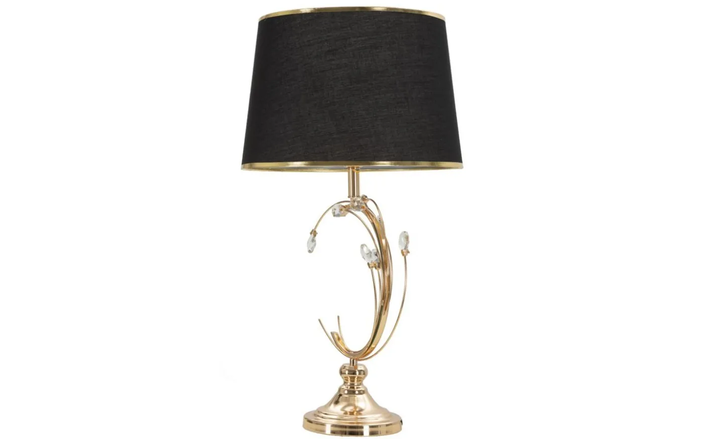 Bordslampa i gyllene metall med geometrisk dekoration med eleganta applikationer som påminner om blommor. Komplett med svart tyglampskärm med guldkant.
