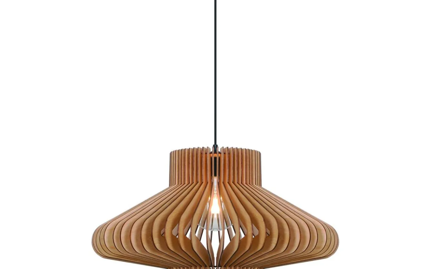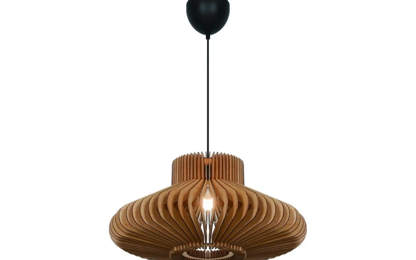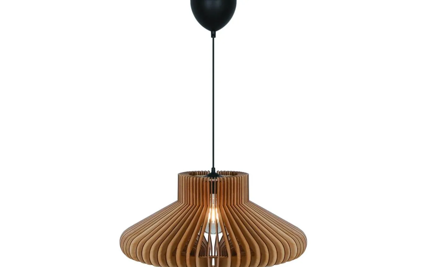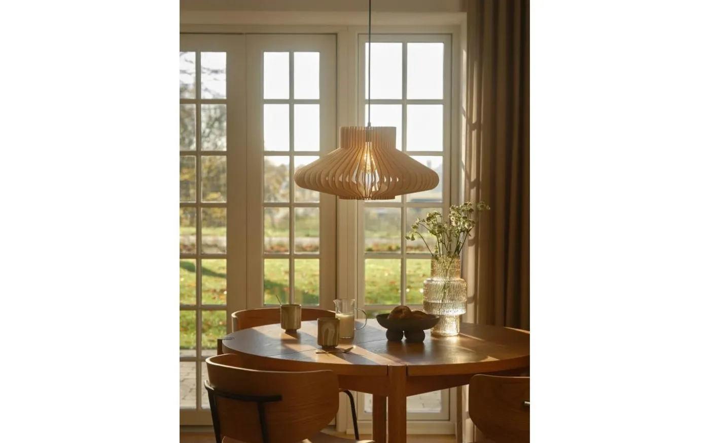 Manago har en skärm av trälameller i en grafisk silhuett som skapar en varm och behaglig ljusfördelning. Välj ditt eget utseende genom att montera trälamellerna på det sätt du föredrar. Perfekt att hänga i ett hörn eller över ett matbord.
