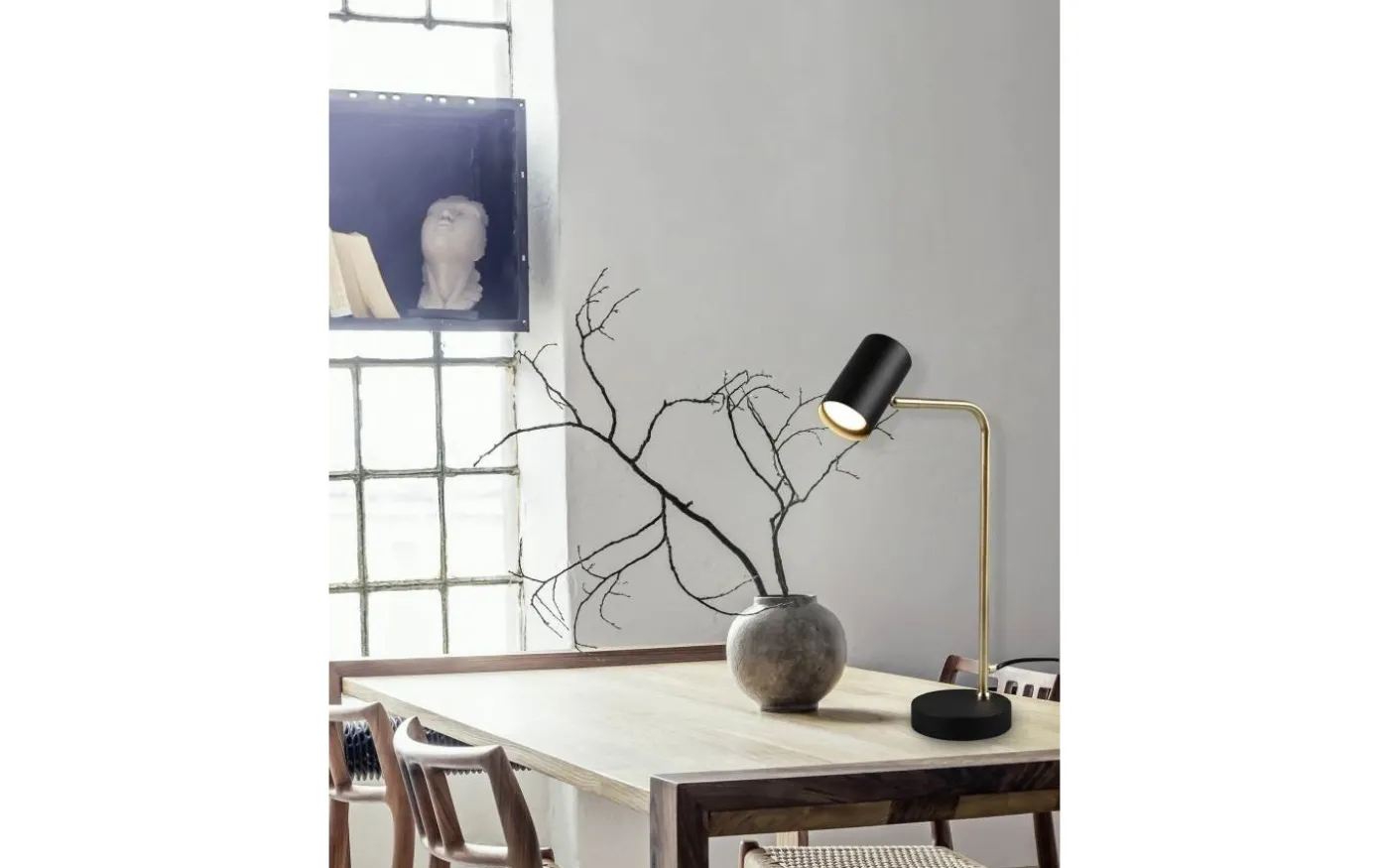 Den minimalistiska inredningstrenden blir alltmer populär och skapar en lugnande och harmonisk miljö. Tack vare de rena linjerna och den minimalistiska designen hos bordslampan MARLEY tar ljuset plats och ger stämningsfulla ljusaccenter. Lamphuvudet är rörligt och kan riktas fritt uppåt och nedåt. Oavsett om det är som läslampa på ett skrivbord eller som accentlampa på en byrå, sätter bordslampan scenen för speciella platser. Kombinationen av färgerna mattsvart och matt mässing skapar en modern armatur som skapar färgkontraster. För modern och pålitlig belysning rekommenderas användning av en LED-lampa. Den erbjuder hög ljuskvalitet, är mångsidig och övertygar med jämn belysning. Dess långa livslängd och låga värmeutveckling gör den till det perfekta valet för en mängd olika tillämpningar. Ljuskälla: exklusiv 1x GU10 · max. 5W. Extra information: IP20, Lampa(or) ingår ej, Strömbrytare