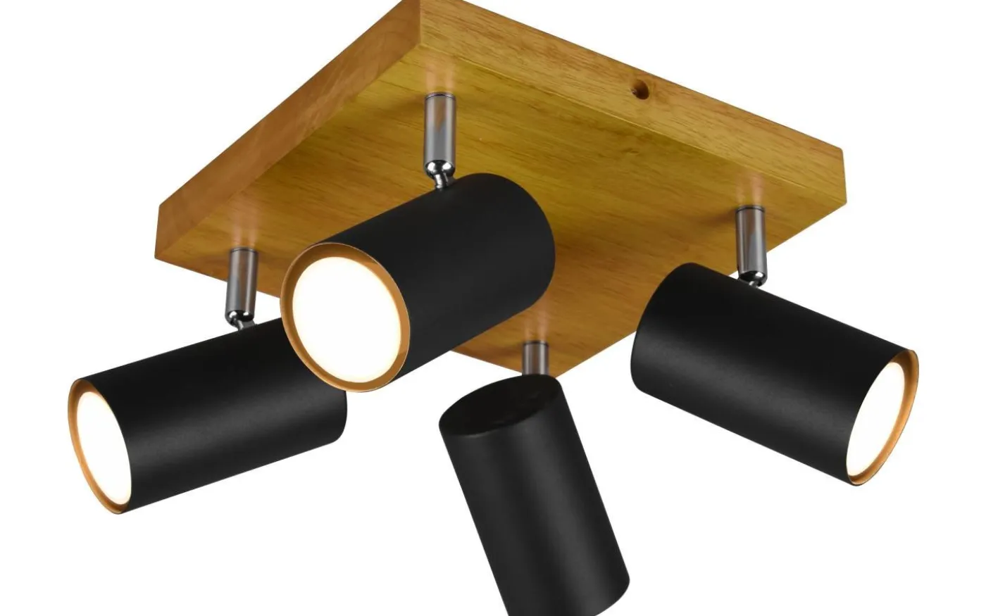 Perfekt och variabelt ljus! MARLEY-spotlighterna är inte bara praktiska i form och funktion, utan framför allt en sak: minimalistiska! Armaturen har en diskret design och imponerar med sitt högkvalitativa utförande. Spotlighterna på den fyrflammiga taklampan är fritt rörliga och kan individuellt justeras efter behov. Oavsett om det är i köket, hallen eller vardagsrummet: MARLEY är mångsidig och kan enkelt kombineras med olika inredningsstilar. Den moderna kombinationen av trä och metall i mattsvart säkerställer mysighet och är helt trendig. För modern och pålitlig belysning rekommenderas en LED-lampa. Den erbjuder hög ljuskvalitet, är mångsidig och övertygar med jämn belysning. Dess långa livslängd och låga värmeutveckling gör den till det perfekta valet för en mängd olika användningsområden. Ljuskälla: exklusiv 4x GU10 · max. 35W. Extra information: Takmontering, IP20, Lampa(or) ingår ej
