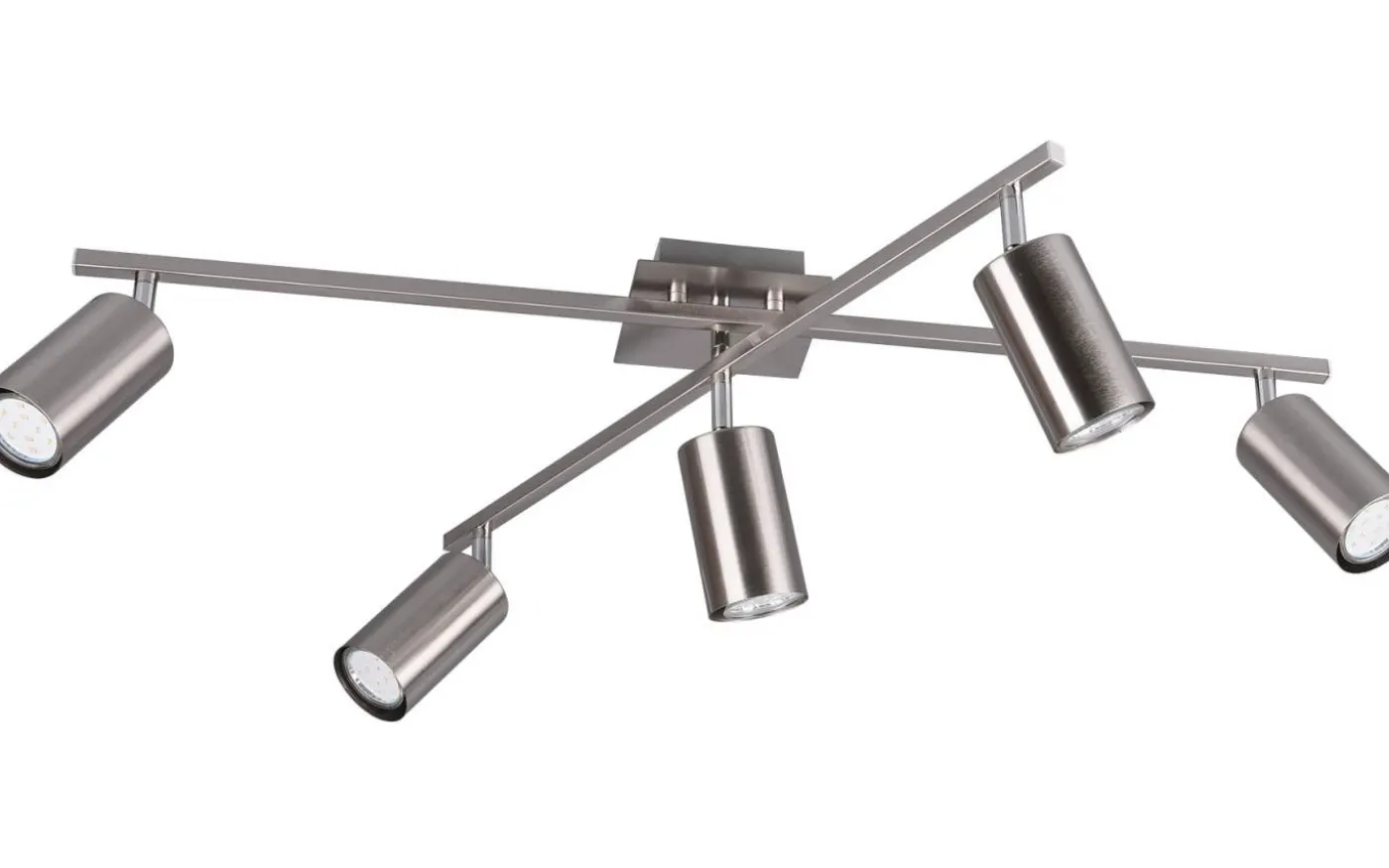 Perfekt och variabelt ljus! MARLEY taklampa är inte bara praktisk i form och funktion, utan framför allt en sak: helt enkelt vacker! De individuella spotlightsna har en diskret design och imponerar med sitt högkvalitativa utförande. Armarna och spotlightsna på taklampan med 5 ljuskällor är fritt rörliga och kan justeras individuellt efter behov. Oavsett om det är i köket, i hallen eller i vardagsrummet: MARLEY är mångsidig och kan enkelt kombineras med olika inredningsstilar. Den är designad i matt nickel och kan därför elegant komplettera moderna och klassiska färgkoncept. För modern och pålitlig belysning rekommenderas en LED-lampa. Den erbjuder hög ljuskvalitet, är mångsidig och övertygar med jämn belysning. Dess långa livslängd och låga värmeutveckling gör den till det perfekta valet för en mängd olika användningsområden. Ljuskälla: exklusiv 5x GU10 · max. 35W. Extra information: Takmontering, IP20, Lampa(or) ingår ej, Vridbar