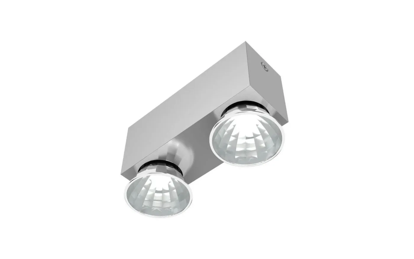 Kantig armatur av aluminium med två GU10 socklar. Ljuskällorna kan ej riktas.