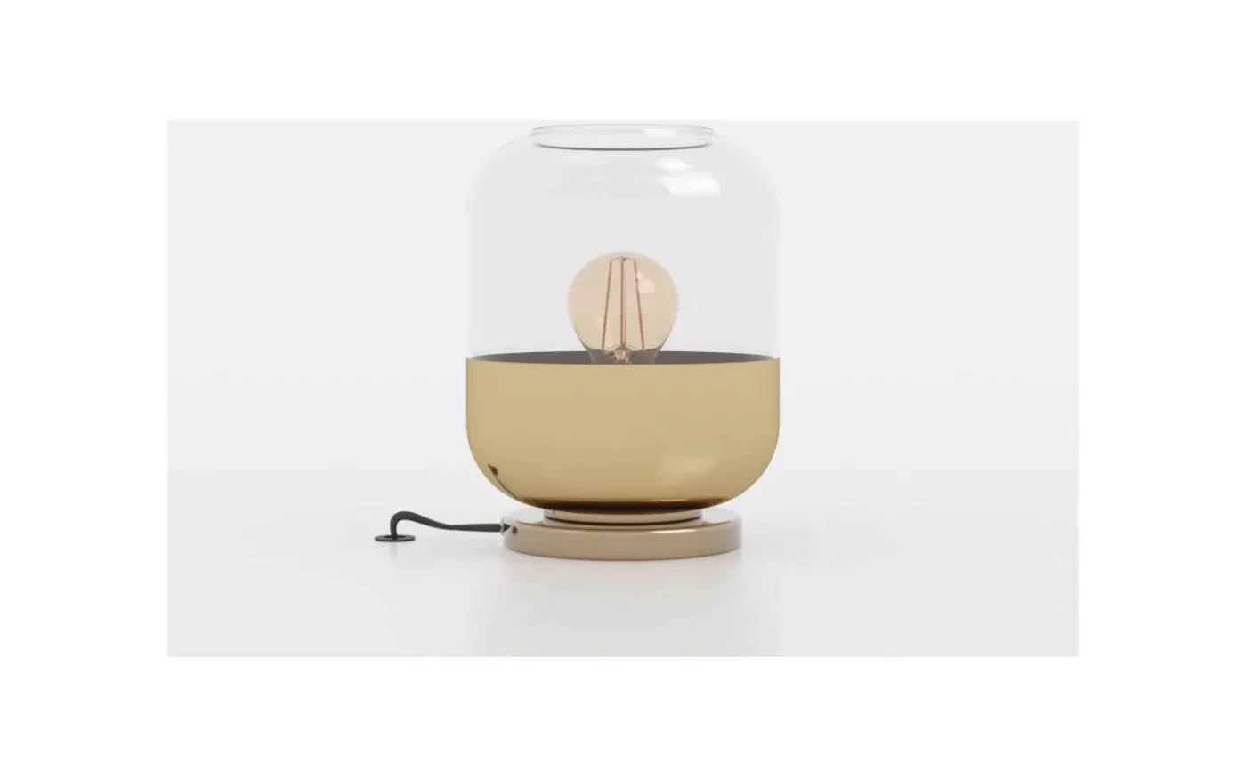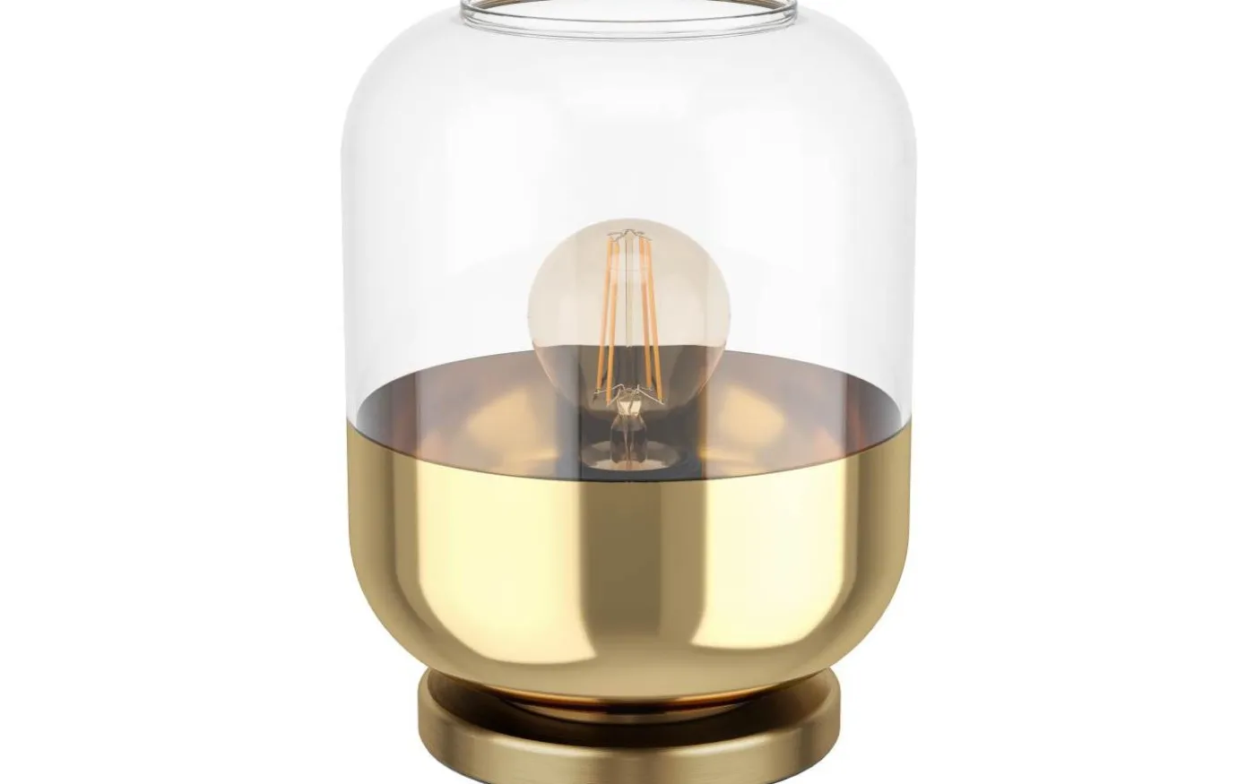Det här är en stilren Maryvilla bordslampa med en höjd av 23 cm, som har en modern och elegant design. Den kombinerar en bronsfot med en guldig samt genomskinlig överdel som visar glödlampan inuti, vilket ger en snygg kontrast och skapar en varm atmosfär i rummet. Den är perfekt som en dekorativ ljuskälla i ett vardagsrum, sovrum eller kanske på ett kontor.