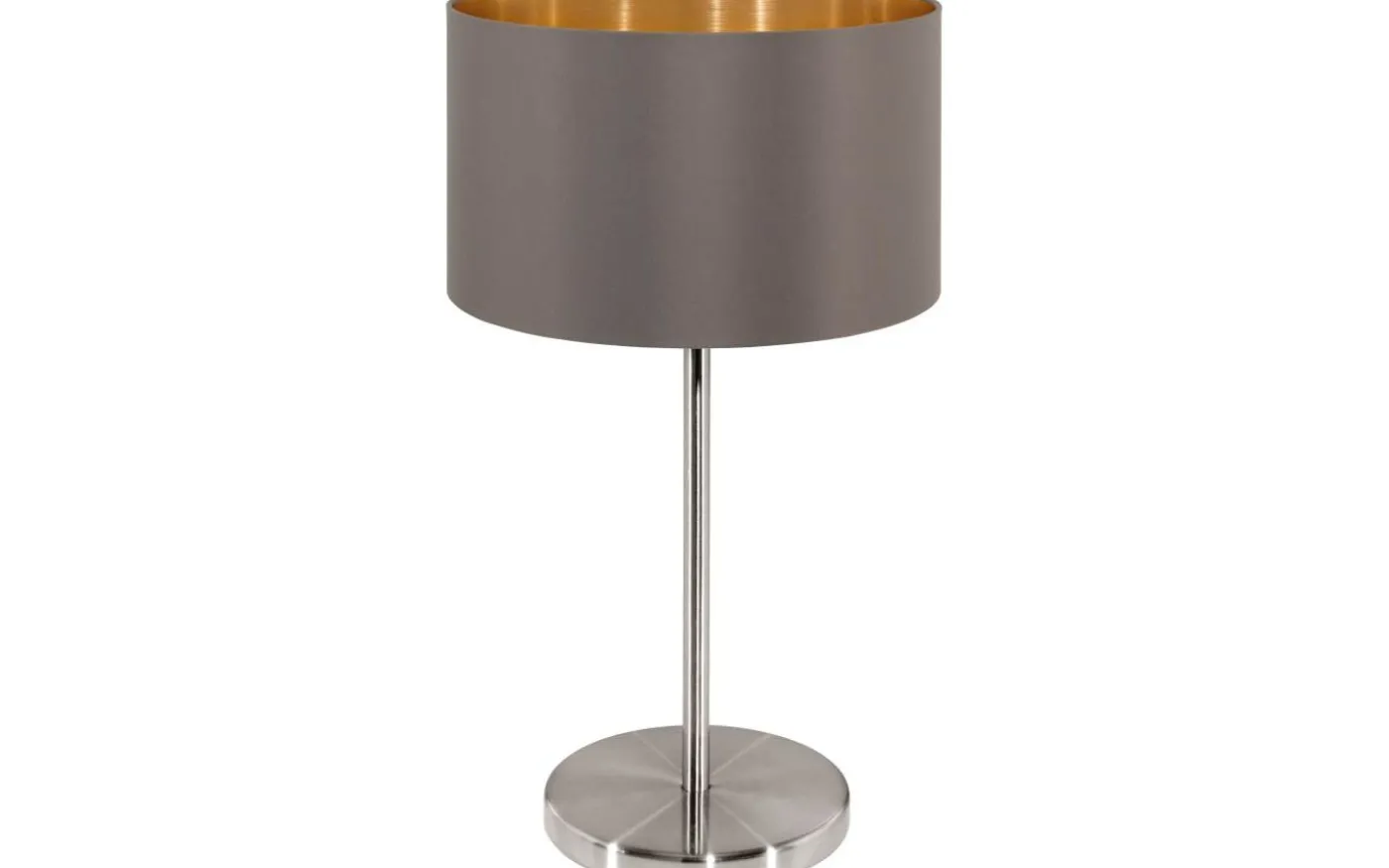 Denna bordsarmatur från serien MASERLO är tillverkad av satinnickelstål och tyg i färgerna Cappuccino och guld och manövreras av en kabelbrytare. Den har skyddsisolering och behöver en E27-lampa för att lysa.