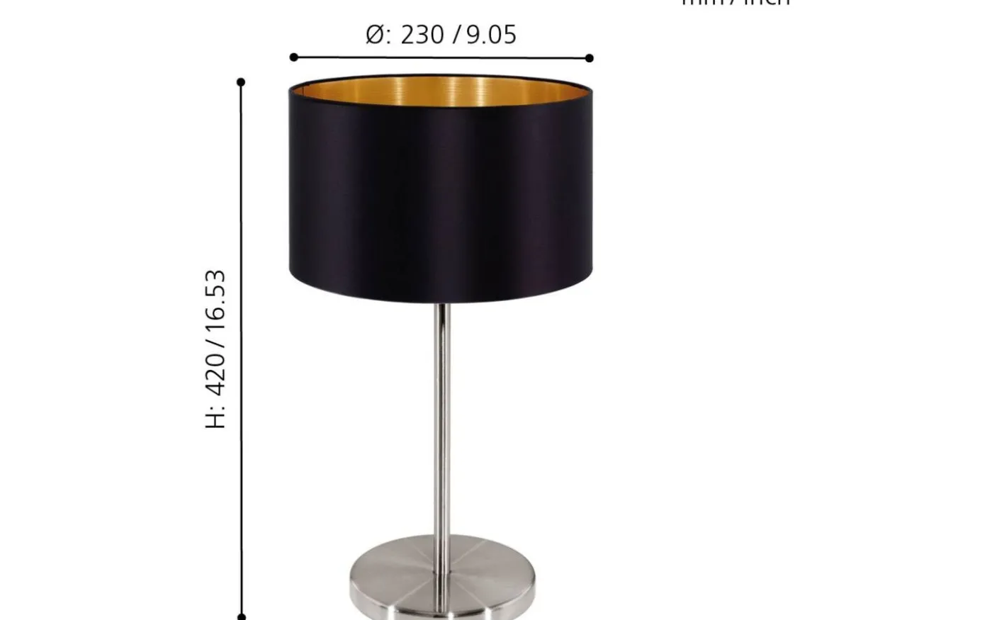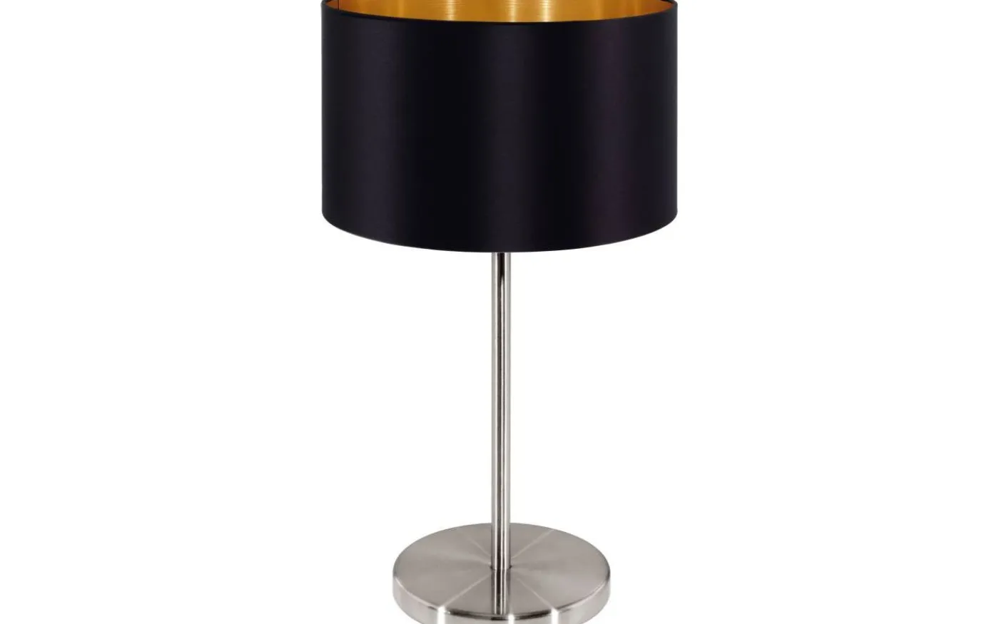 Denna bordsarmatur från serien MASERLO är tillverkad av satinnickelstål och tyg i färgerna svart och guld och manövreras av en kabelbrytare. Den har skyddsisolering och behöver en E27-lampa för att lysa.