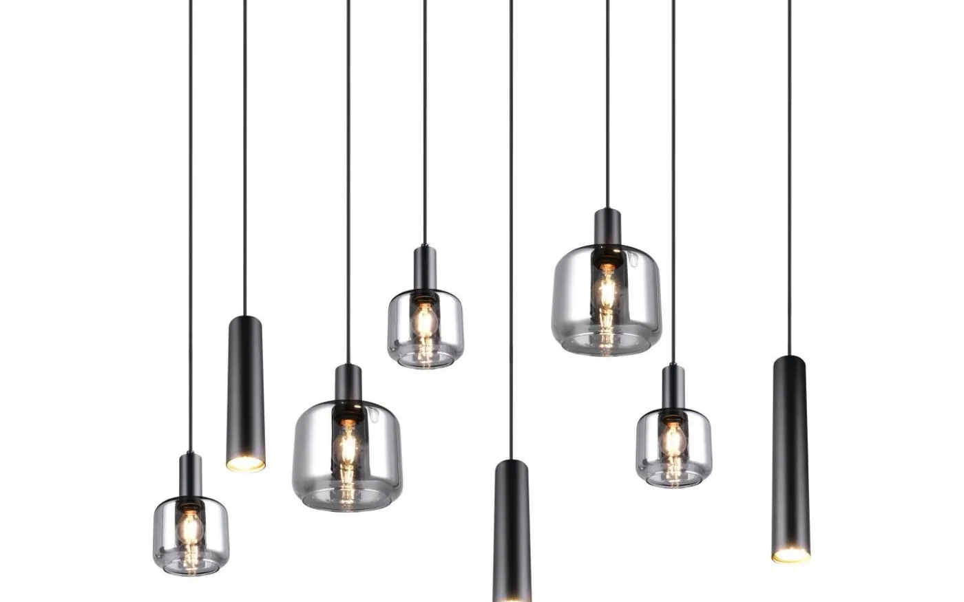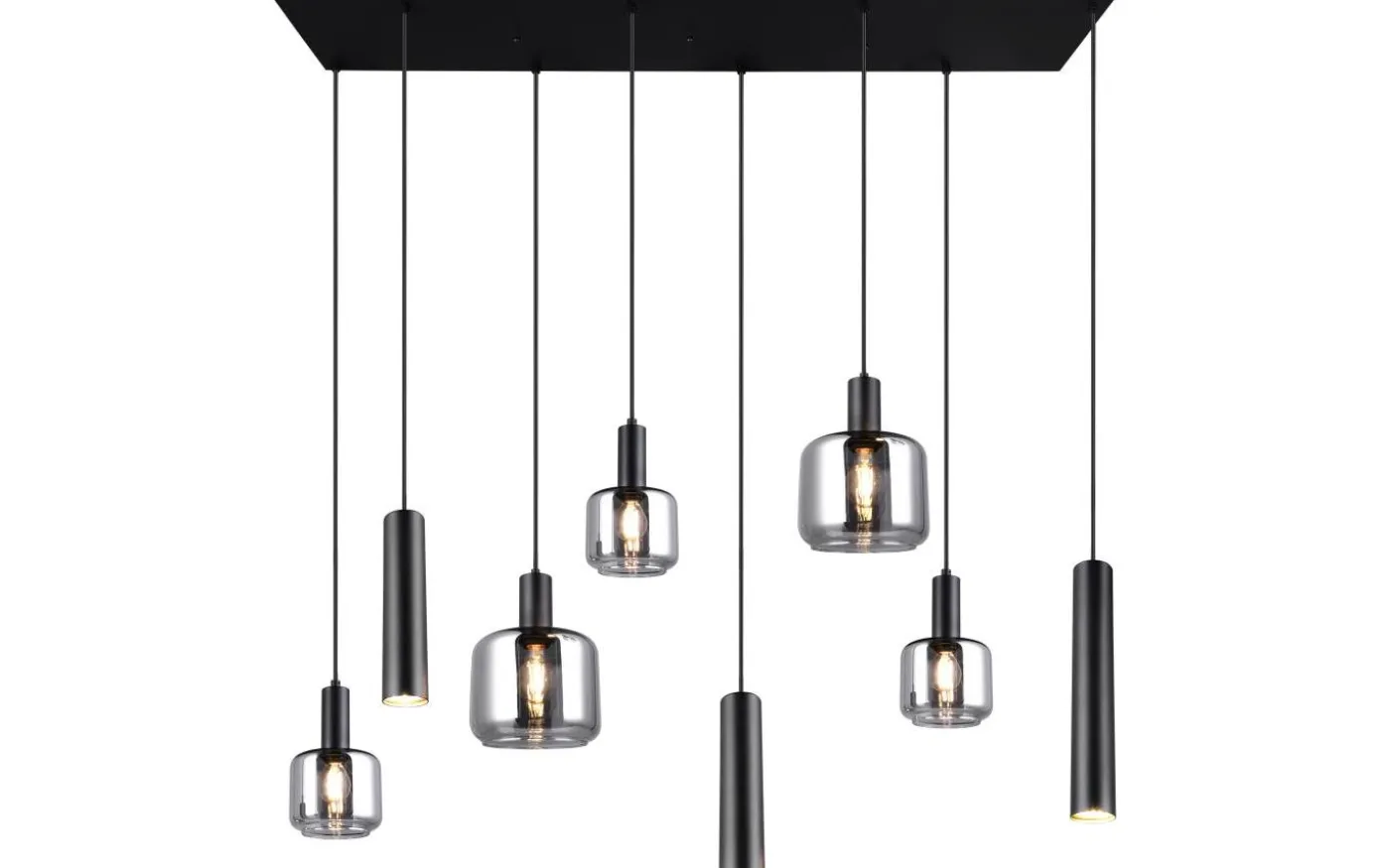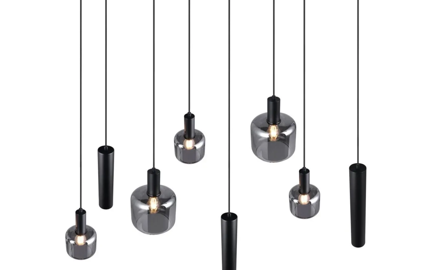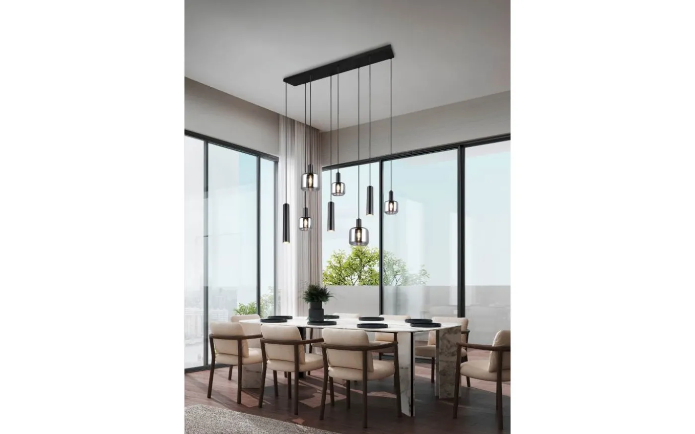 Pendelarmaturen MATARO med åtta ljuskällor imponerar med sin moderna och eleganta design. Den kombinerar tre smala metallarmaturer med fem glaselement, som tillsammans skapar en speciell ljusfördelning och fascinerande reflektioner i rummet. Den harmoniska kombinationen av dessa material förhöjer inte bara ditt hems utseende, utan gör också lampan till ett elegant blickfång ovanför alla matbord. Metallen är mattsvart, medan glaselementen är förkromade, vilket ger armaturen en subtil glans och en lätt spegeleffekt. För modern och pålitlig belysning rekommenderas användning av en LED-lampa. Den erbjuder hög ljuskvalitet, är mångsidig och övertygar med jämn belysning. Dess långa livslängd och låga värmeutveckling gör den till det perfekta valet för en mängd olika användningsområden. Ljuskälla: exklusiv 2x E27 · max. 10W. Ljuskälla: exklusiv 2x E27 · max. 10W.. Extra information: Justerbar i höjd, Takmontering, IP20, Lampa(or) ingår ej