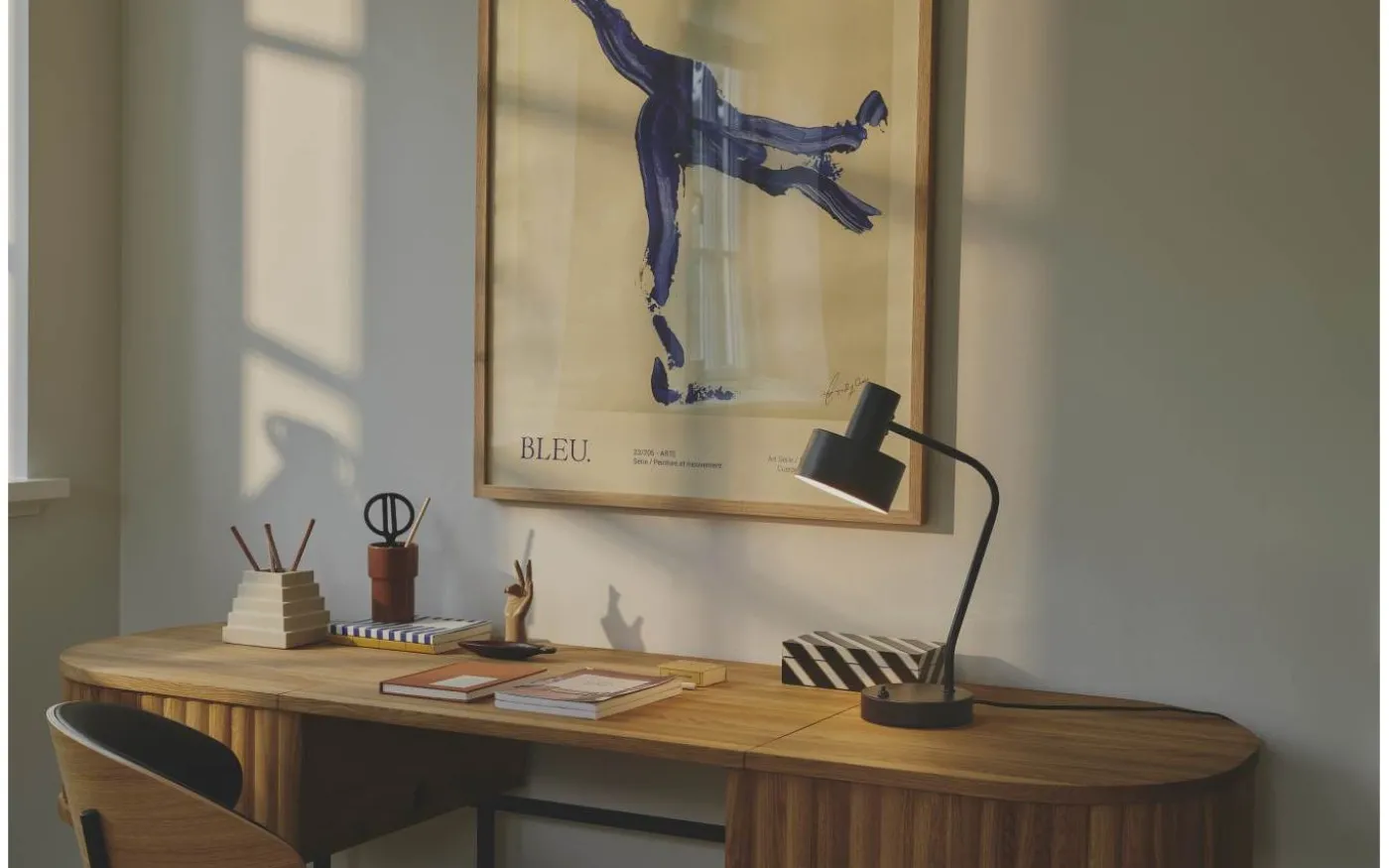 Skrivbordslampan har flexarm och går att justera i önskat läge.