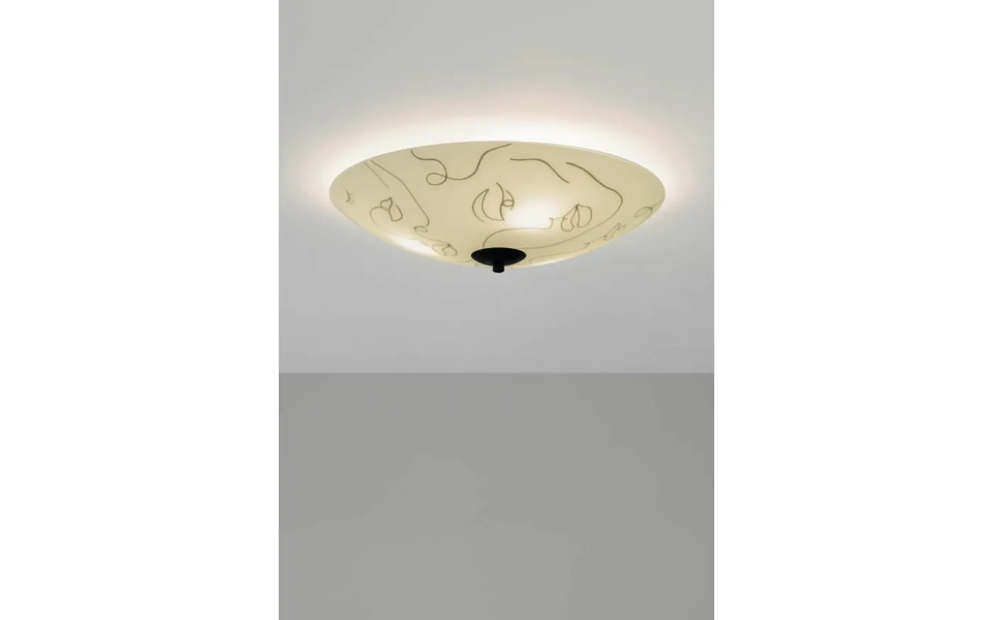 Taklampa i vitt glas med mönster formgivet av Ida Andersson. Enkel plafond med dekorativt linjemönster i svart. Sprider ett behagligt allmänljus i rummet. Lampan har en diameter på 43 cm.