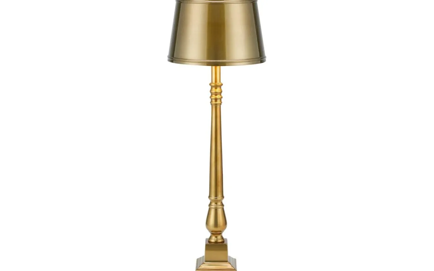 Bordslampa i klassisk stil med både skärm och fot tillverkade av metall med finish i antikfärgad mässing. Lampans skärm har en diameter om 23 cm och lampans totalhöjd om 66cm. Höjden gör att lampan passar fint på fönsterbrädan, skänken eller nattduksbordet style. Finns även i färgen antik silver.