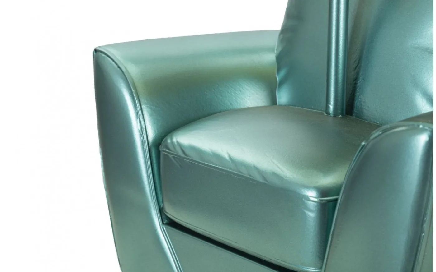 Bordslampa i turkos harts i form av en fåtölj inspirerad av 70-talet. Komplett med lampskärm i turkos tyg.