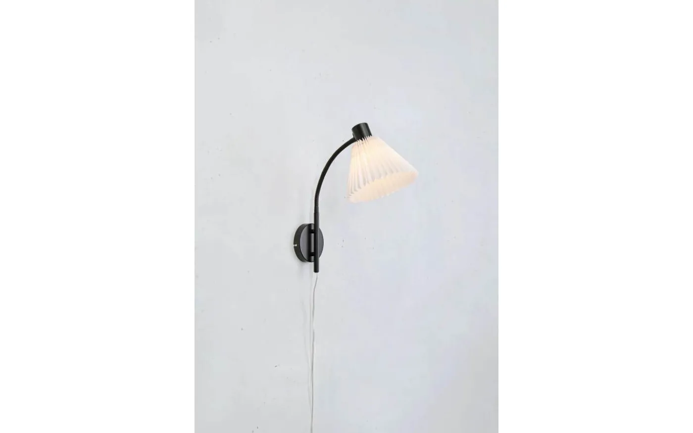 Stilren vägglampa som kombinerar klassisk plisserad skärm och en svart fot med en skandinavisk stil. Lampan har ett praktiskt böjbart lamphuvud med en vit plisserad skärm som släpper igenom ett behagligt ljus. Den plisserade skärmen har en diameter om 21 cm. Totalhöjd om 40cm. Passar perfekt som dekorativ sänglampa. Mira finns även som serie med golvlampor och bordslampa.