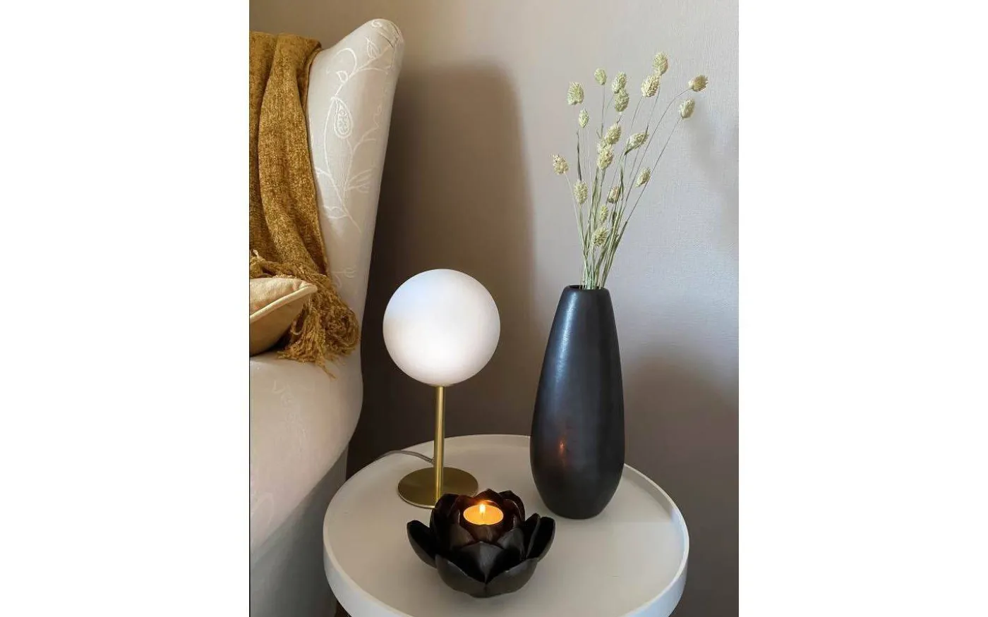Molekyl bordslampa med lampfot i matt mässing och opalvit glaskupa. Max 25W G9, ingår ej. Sladd med mellanströmbrytare och stickpropp. Vacker lampa som med fördel kan kombineras med den högre höjden i serien.