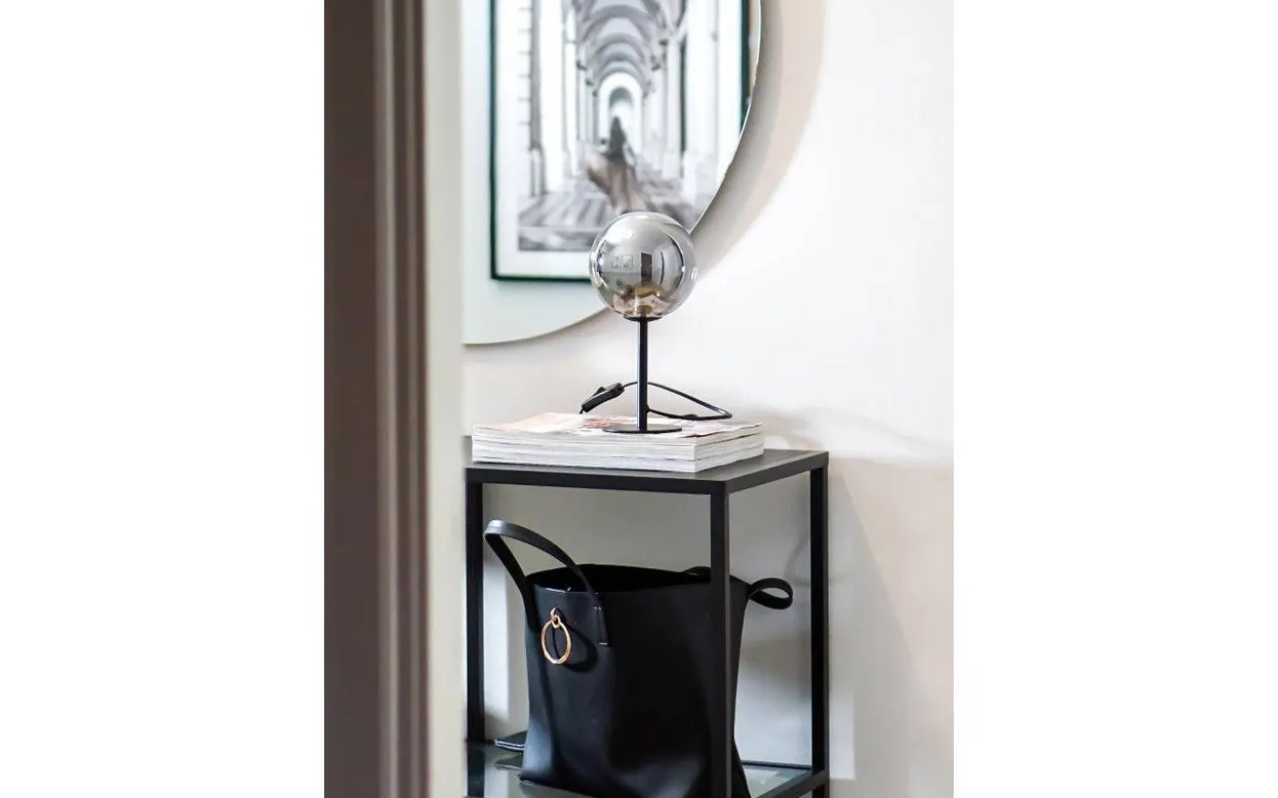 Molekyl bordslampa med lampfot i svart metall och sotad glaskupa. Max 25W G9, ingår ej. Sladd med mellanströmbrytare och stickpropp. Vacker lampa som med fördel kan kombineras med den högre höjden i serien.