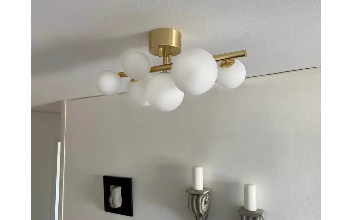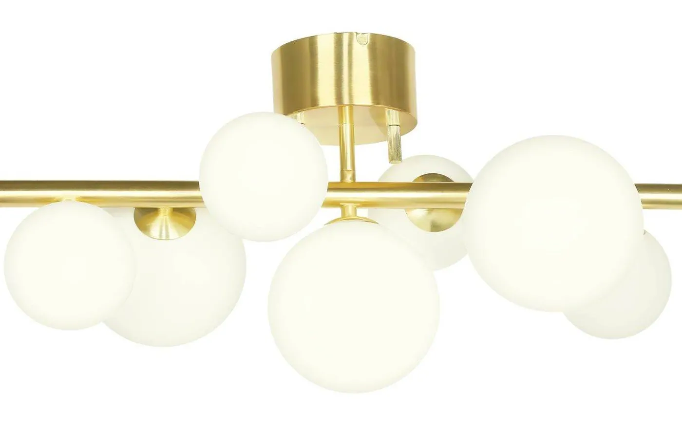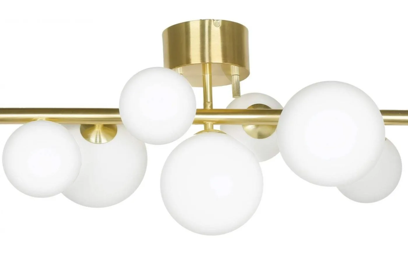 Molekyl trendig plafond i matt mässing med 7 opalvita glaskupor i olika storlekar placerade på en 58 cm lång stång. Max 7x25W G9, ingår ej. Takkoppen är i metall för krokupphäng och med kopplingsplint, lamppropp kan monteras.