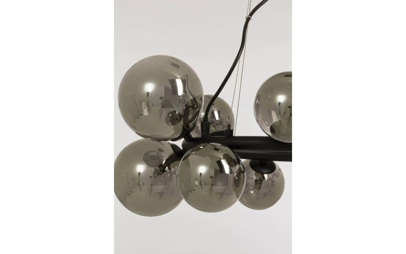 MOLEKYL modern rund taklampa i svart alckerad metall med 10 rökfärgade glaskupor i två olika storlekar. 10 x 25W G9 (ingår ej). Hänger i tre justerbara vajrar. Krokupphäng med takkopp i svart metall.