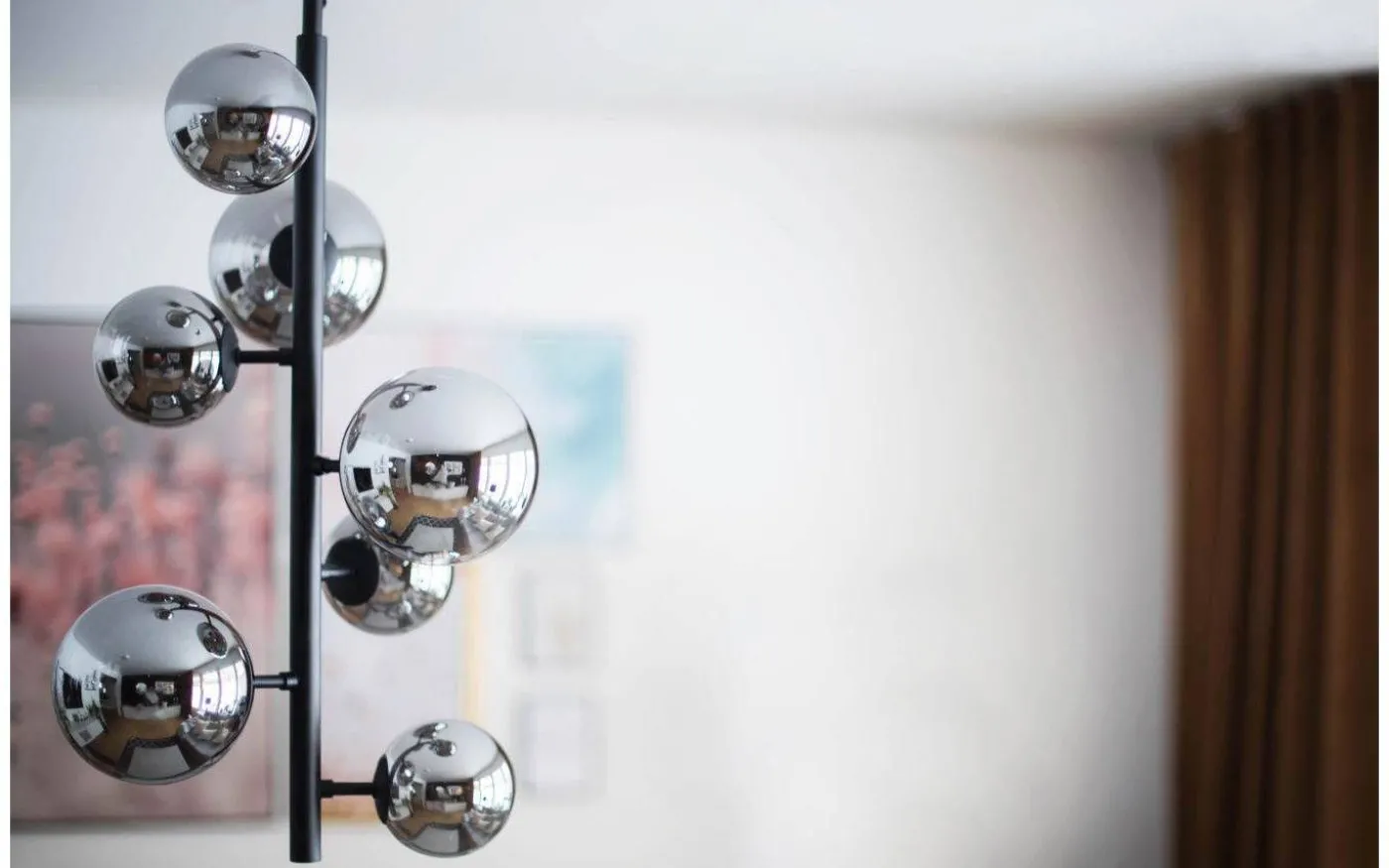 MOLEKYL modern snygg taklampa i svart lackerad metall med 7 rökfärgade glaskupor i två olika storlekar. 7 x 25W G9 (ingår ej). Hänger i justerbar vajer. Krokupphäng med takkopp i svart metall.