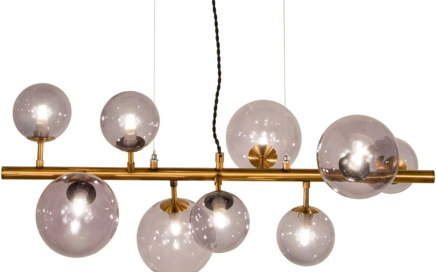 Häftiga Molekyl taklampa, från Aneta Belysning, är en härlig taklampa med stomme i antikfärgad metall kombinerat med nio glasglober med rökfärgat glas. Glasgloberna är i två olika storlekar vilket gör att lampan får en intressant och levande design. Då glasen är handblåsta är varje glas unikt och luftbubblor och små ojämnheter kan förekomma, som en del av det genuina hantverk som tillverkningsprocessen kräver och som blir del av lampans charm och karaktär.