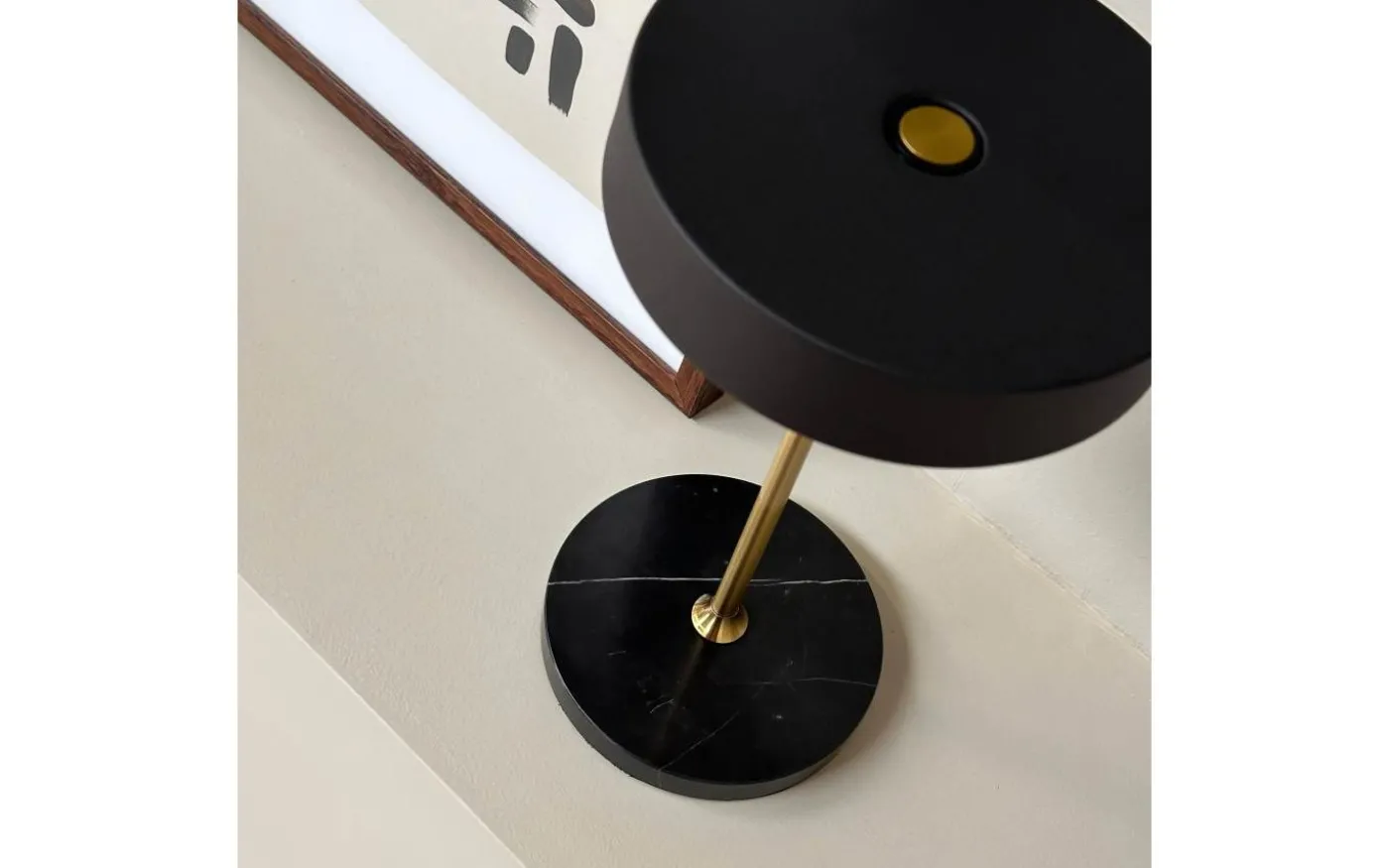 Lampfoten är gjord av massiv svart marmor som följs av detaljer i mässing och avslutas med en vinklingsbar lampskärm i svartfärgad metall.