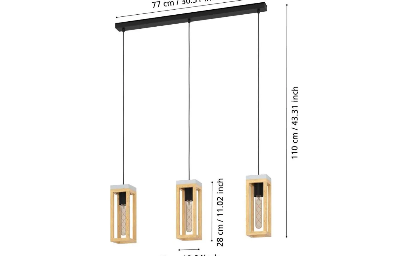 Taklampan Nafferton kombinerar en strömlinjeformad modern design med naturliga toner och material. Den har en svart rektangulär takfäste från vilken tre pendellampor är jämnt upphängda, var och en med en svart kvadratisk metallram och en träinsats som håller en stilren glödlampa. Denna blandning av svart och naturliga trätoner skapar en minimalistisk och ändå varm estetik. Med sina rena linjer och mixade material passar lampan väl i ett modernt kök eller matsal och kan erbjuda både funktionell belysning och ett stilfullt designelement. Den totala längden på 80 cm gör att den kan vara en central del av rummets design utan att ta överhanden.