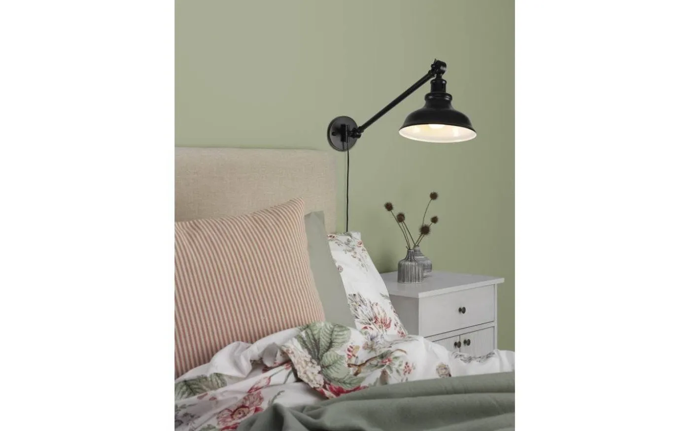Denna vägglampa är gjord i metall med en antiksvart finish och handmålade detaljer i guld. Med sin raka arm, som du kan justera både i sidled och upp/ner, bygger lampan totalt 60 cm ut från vägg. Skärmen har vit insida och en diameter på 17,5 cm. Vägglampan levereras med 2 meter lång sladd med strömbrytare och stickkontakt för vägguttag.