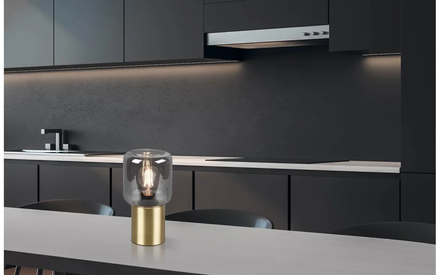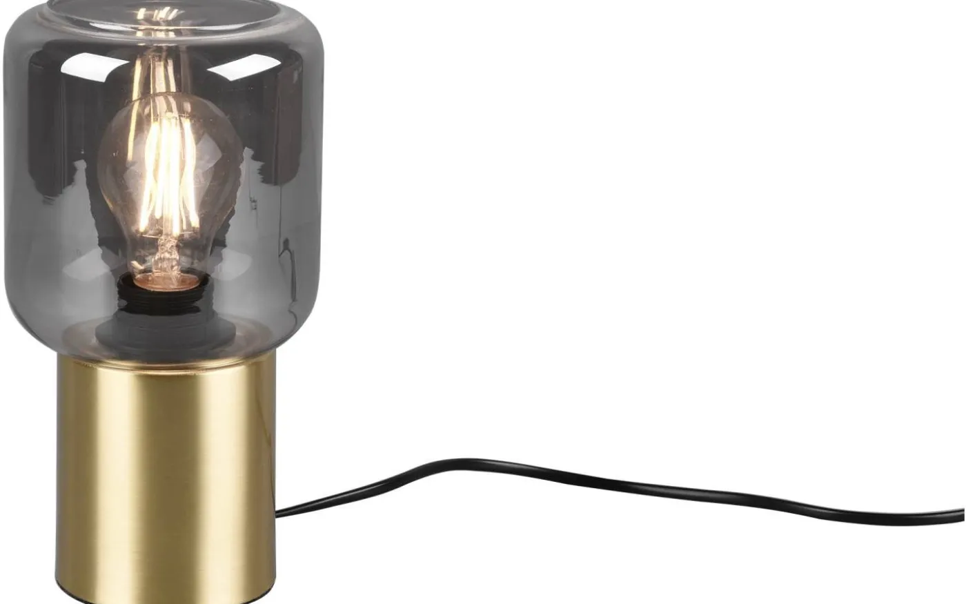 Den moderna bordslampan NICO ger dekorativt ljus. Den minimalistiska designen ser elegant ut och gör lampan till ett modernt dekorativt element. På en byrå eller ett sidobord ger bordslampan ett mjukt och behagligt kompletterande ljus. Lampan är utrustad med en sladdbrytare, vilket gör den enkel att tända och släcka. Kombinationen av matt mässing och en rökfärgad glasskärm resulterar i en modern kombination som kan användas på en mängd olika sätt. För energibesparande belysning rekommenderas att använda en LED-lampa. Dessa är ett optimalt alternativ till konventionella halogenlampor och står för hög ljuskvalitet och energibesparingar på upp till 80 %. Dessutom hjälper LED-lampor dig att dra nytta av lång livslängd, låg värmeutveckling och samtidigt skydda miljön. Ljuskälla: exklusiv 1x E27 · max. 40W. Extra information: Kabelbrytare, IP20, Lampa(or) ingår ej