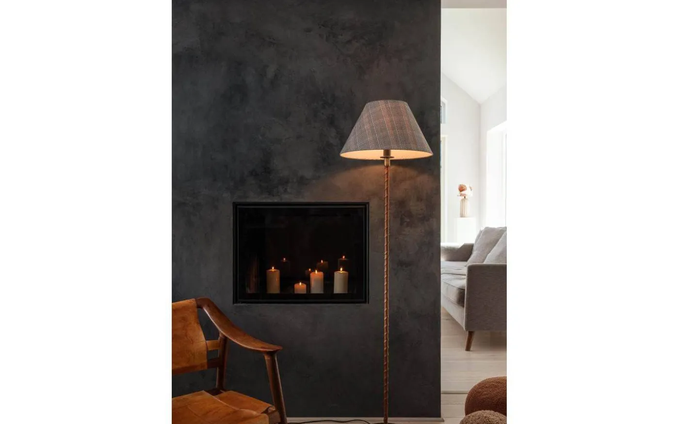 Nora golvfot från PR Home är av enkel och klassisk design. Golvfoten har en finish i antikmässing med en fuskläderdetalj virad runt stommen. Golvfoten är 138cm hög med E27 sockel och passar perfekt ihop med lampskärmar som är mellan 30-40cm i diameter. Lampfoten har en 2m lång svart textilkabel med stickkontakt, strömbrytaren sitter på övre delen av lamphållaren.