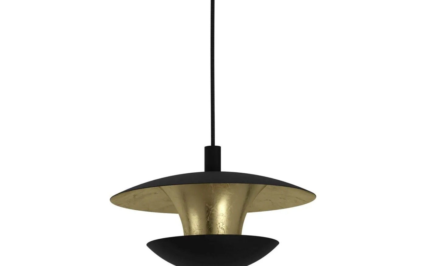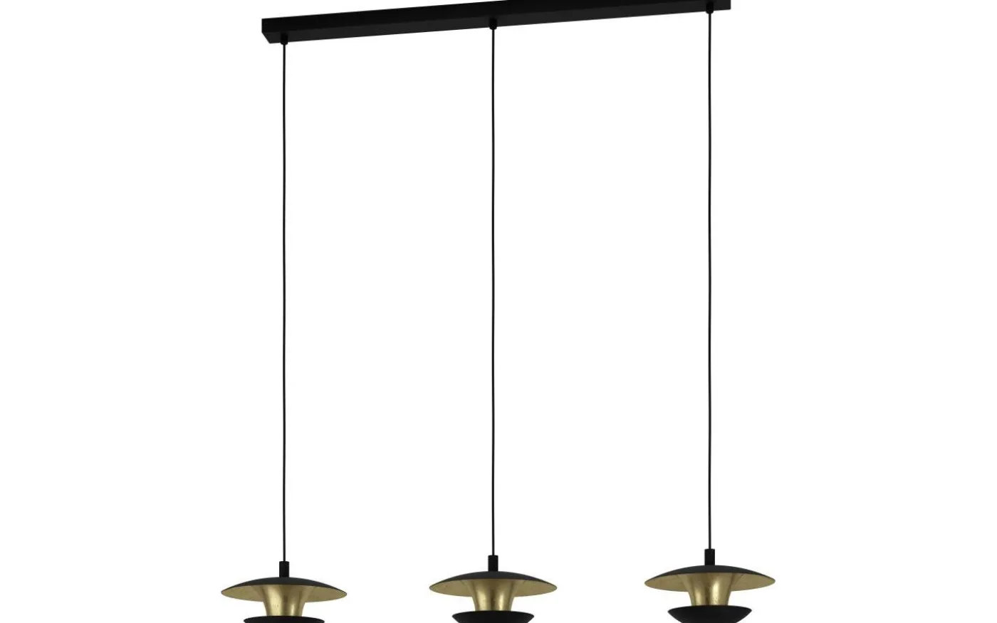 NUVANO taklampa har tre svarta metallskärmar med guldfärgade insidor i bladmetall. Produkten inkluderar GU10 LED-lampor monterade inuti kroppen som kastar ett behagligt varmvitt ljus på området nedanför. Den distinkta designen skapar också indirekt belysning inuti skärmarna, vilket ger den perfekta finishen till den dramatiska looken. Tack vare det eleganta utseendet på skärmarna kombinerat med den långa och svarta metallkapellet smälter den taklampa perfekt in i moderna interiörer och skapar en distinkt, iögonfallande funktion ovanför bordet i matsalen.