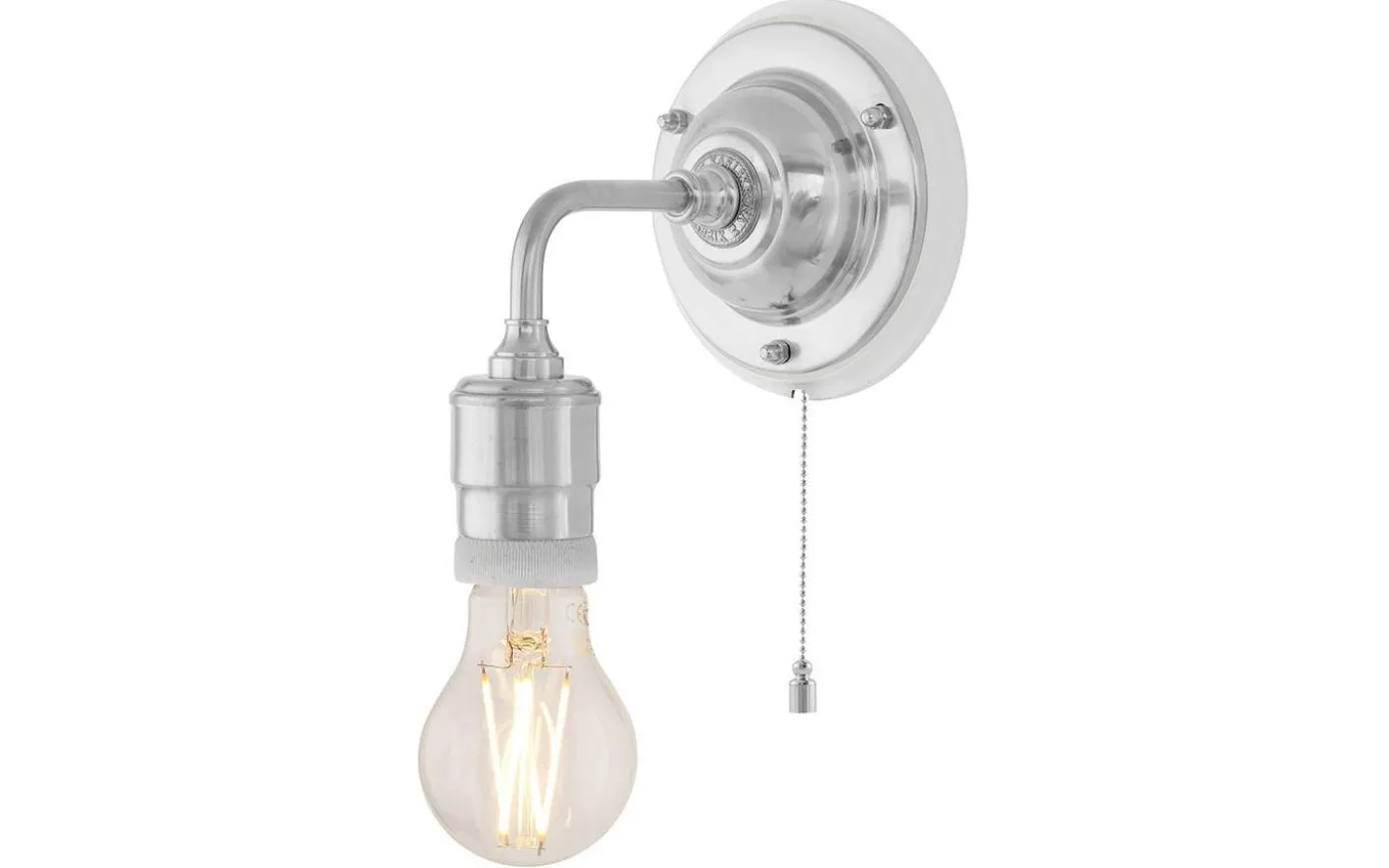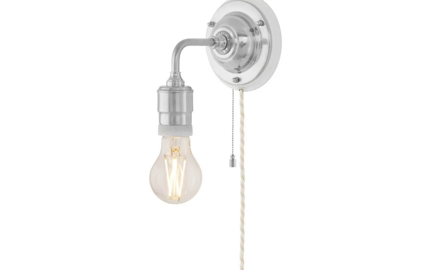 Klassisk väggarmatur tillverkad helt i mässing. Lampan saknar skärmfattning och är med sin oskärmade ljuskälla framförallt avsedd för miljöer i mer industriell stil. För fast montage. Kan kompletteras med knoppledning och stickkontakt för vanligt vägguttag.