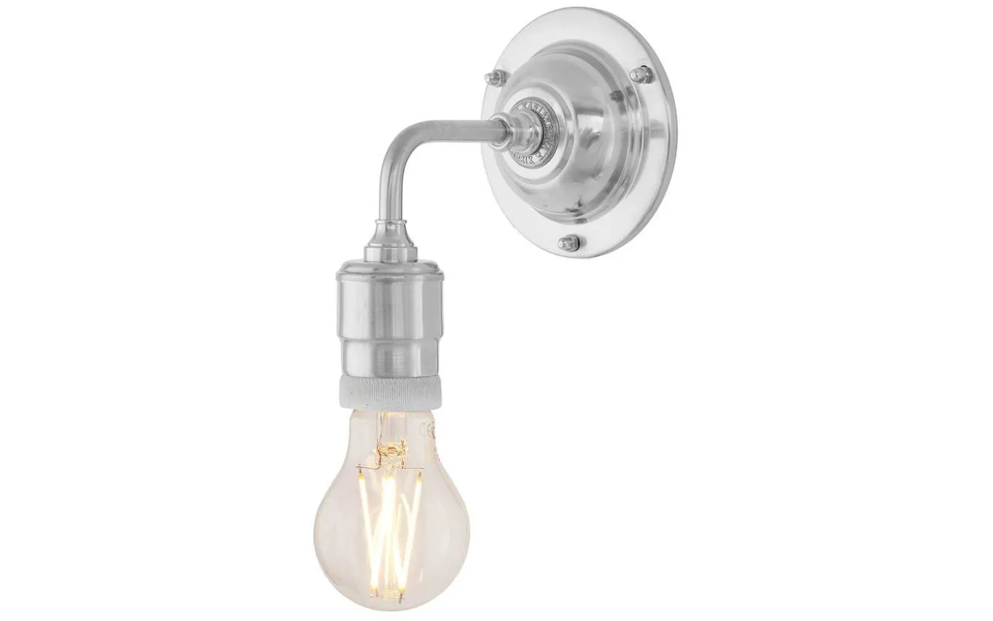 Klassisk väggarmatur tillverkad helt i mässing. Lampan saknar skärmfattning och är med sin oskärmade ljuskälla framförallt avsedd för miljöer i mer industriell stil För fast montage. För att gå in med kuloledning kompletteras med en distansplatta.