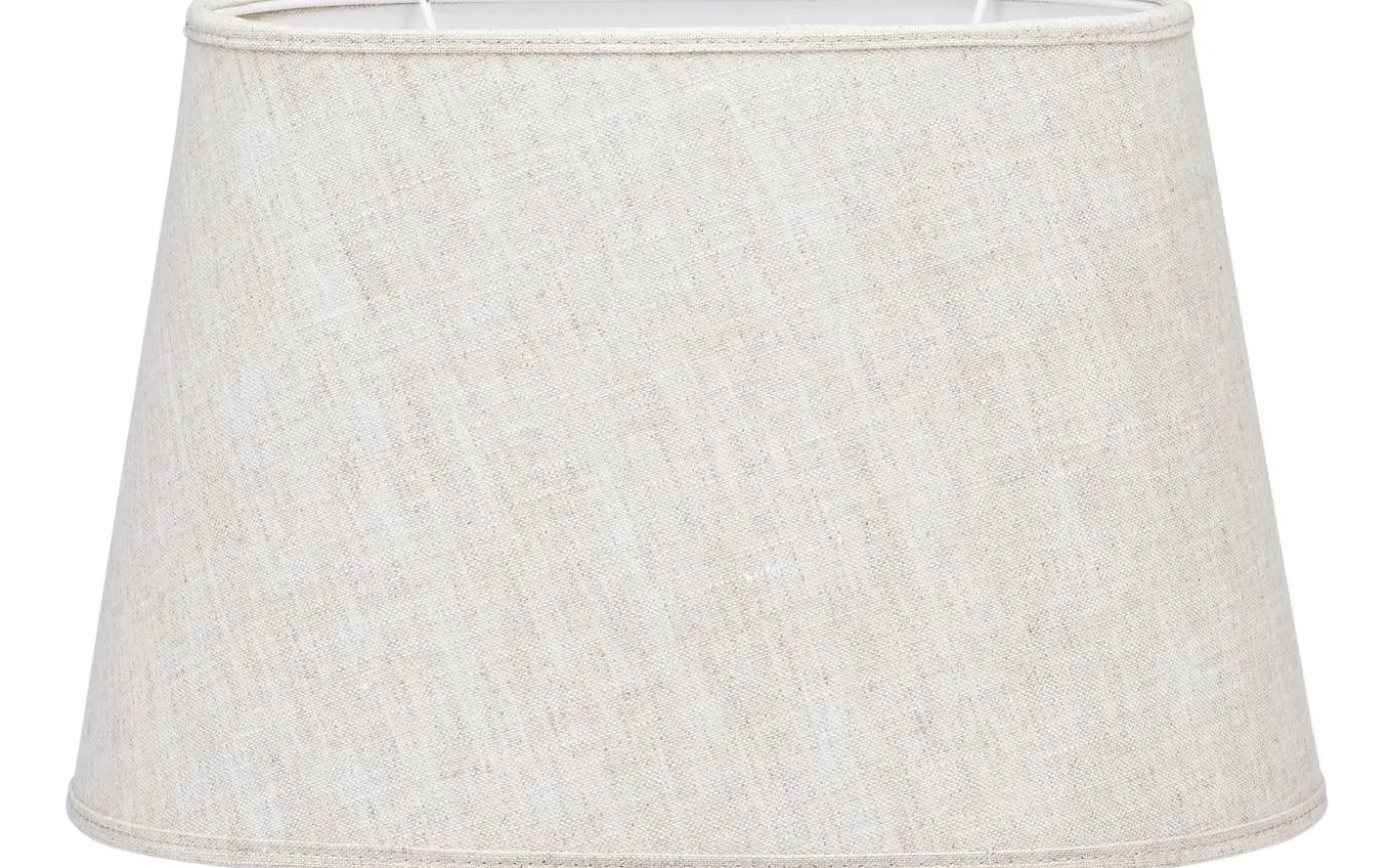 Omera lampskärm från PR Home är en ovalformad lampskärm i linnetyg med E27-ringfäste. Lampskärmen har en vit insida med kantband i ovan-/ och underkant.