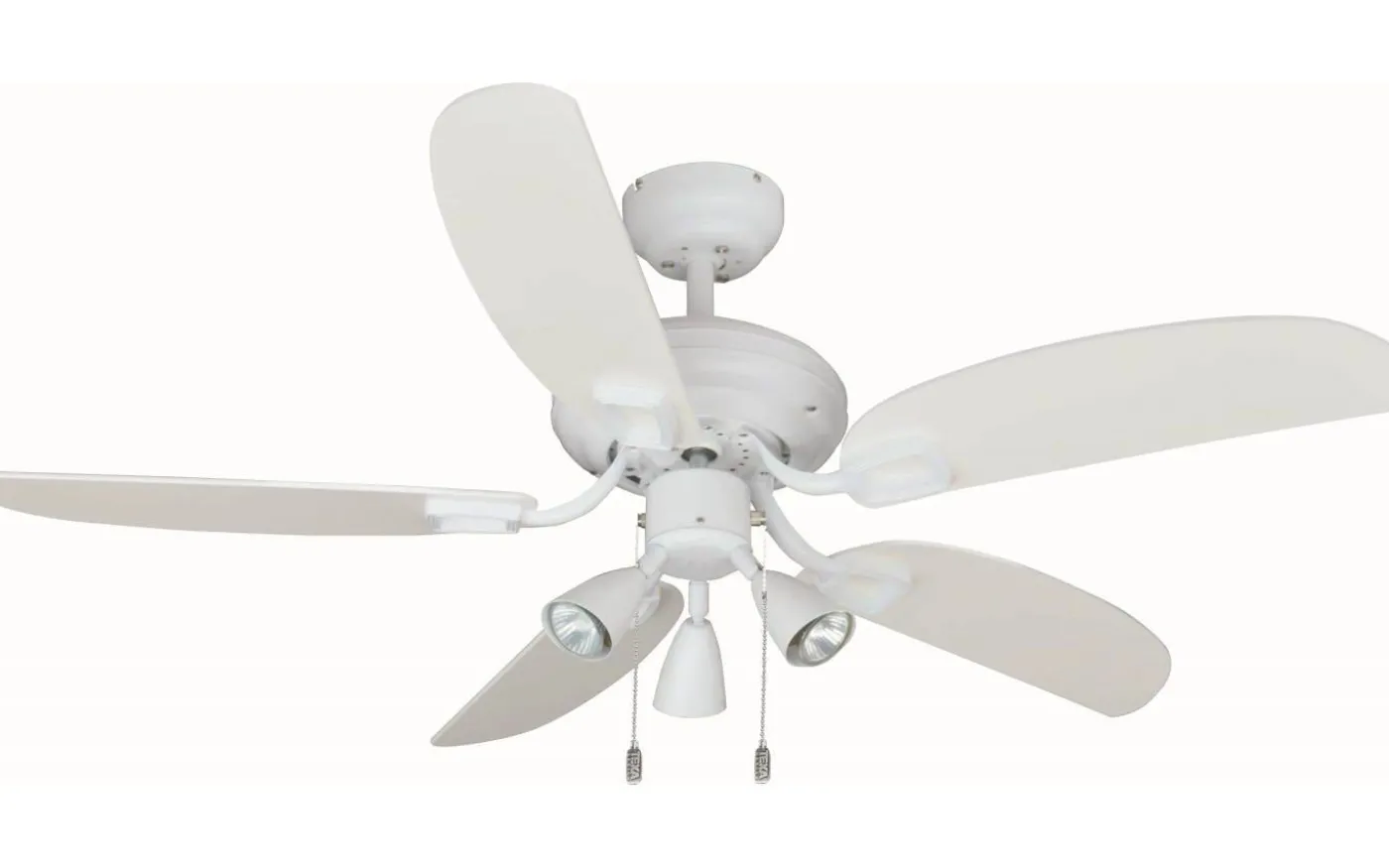 Motorn är vit. Bladen är vändbara, vita på ena sidan och träimitation på andra sidan.
