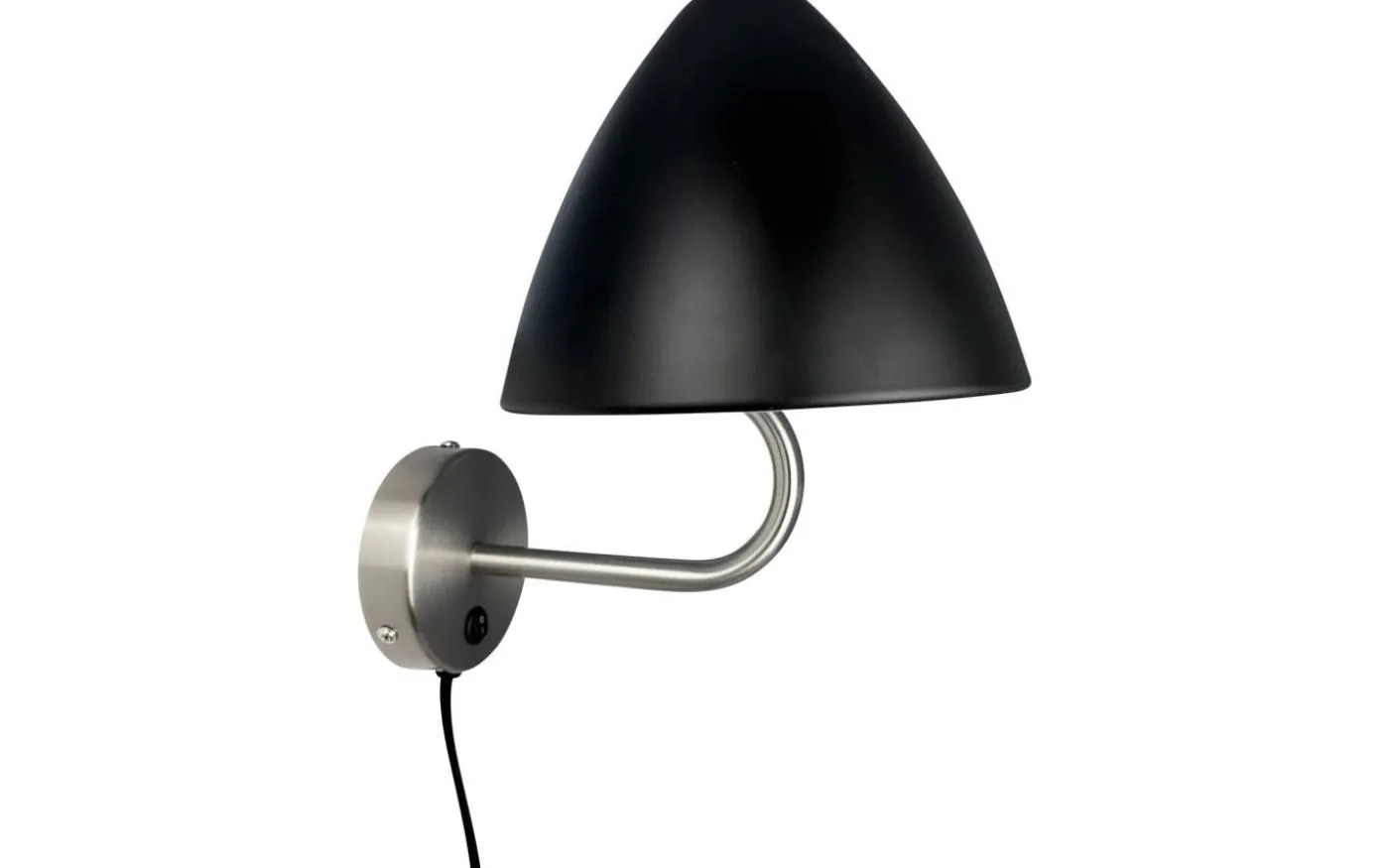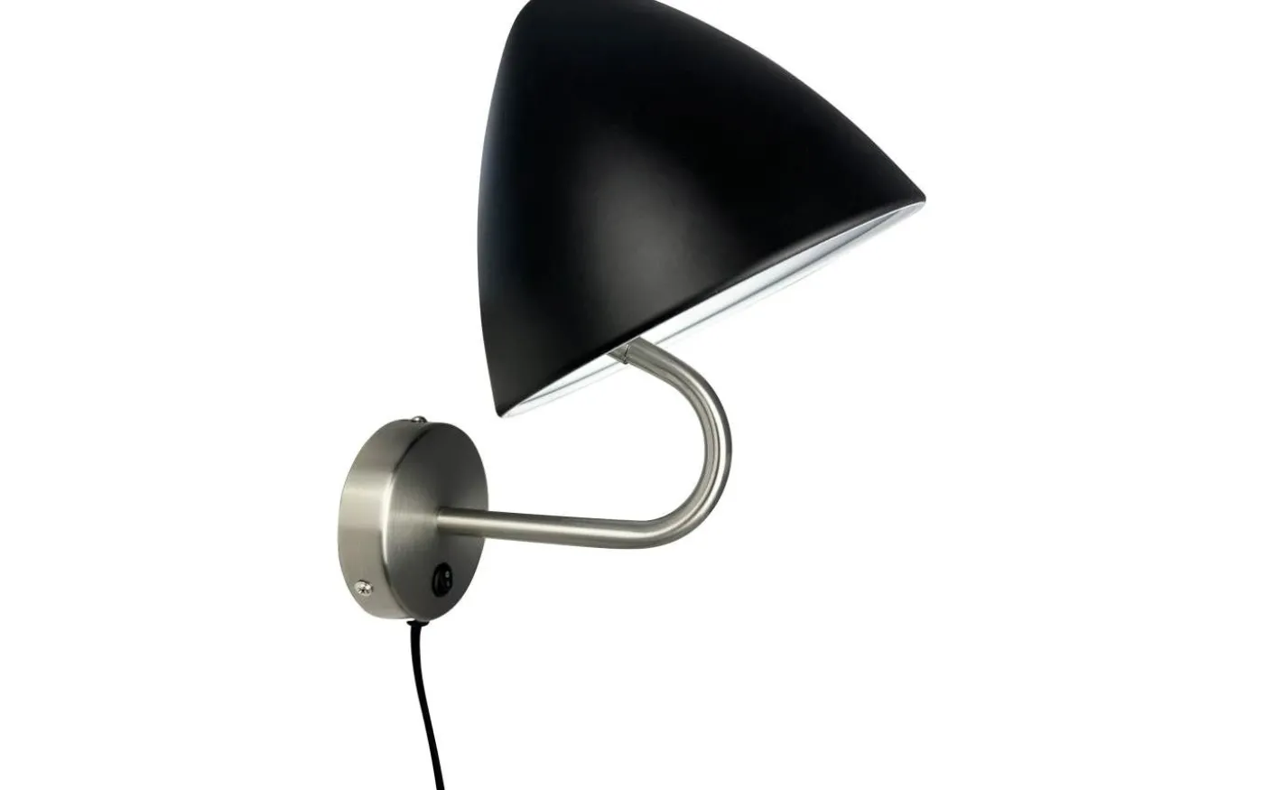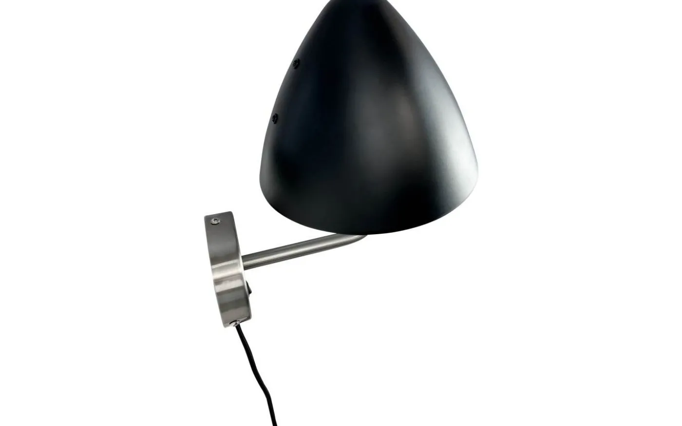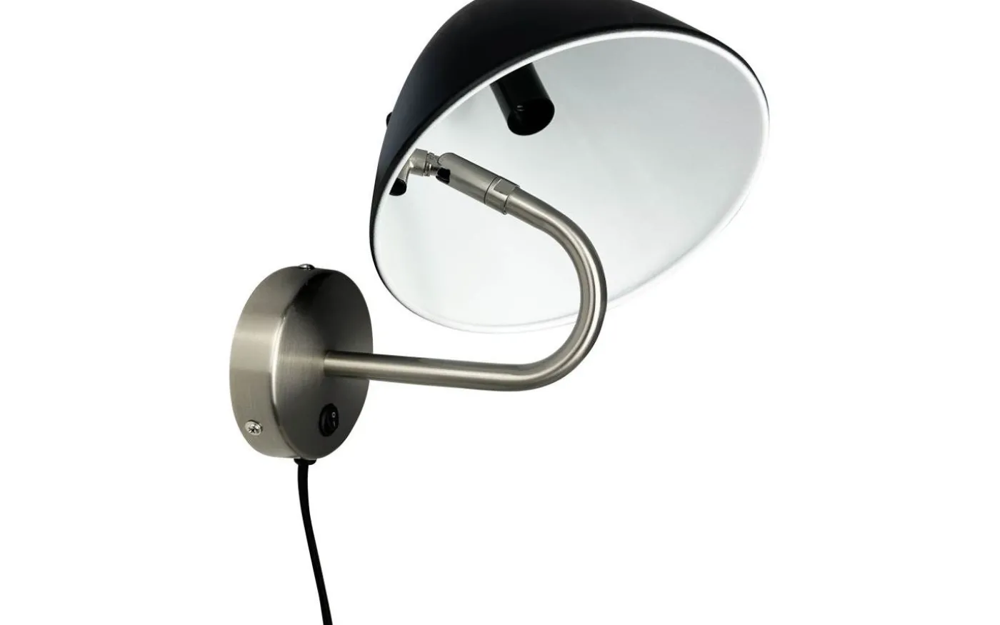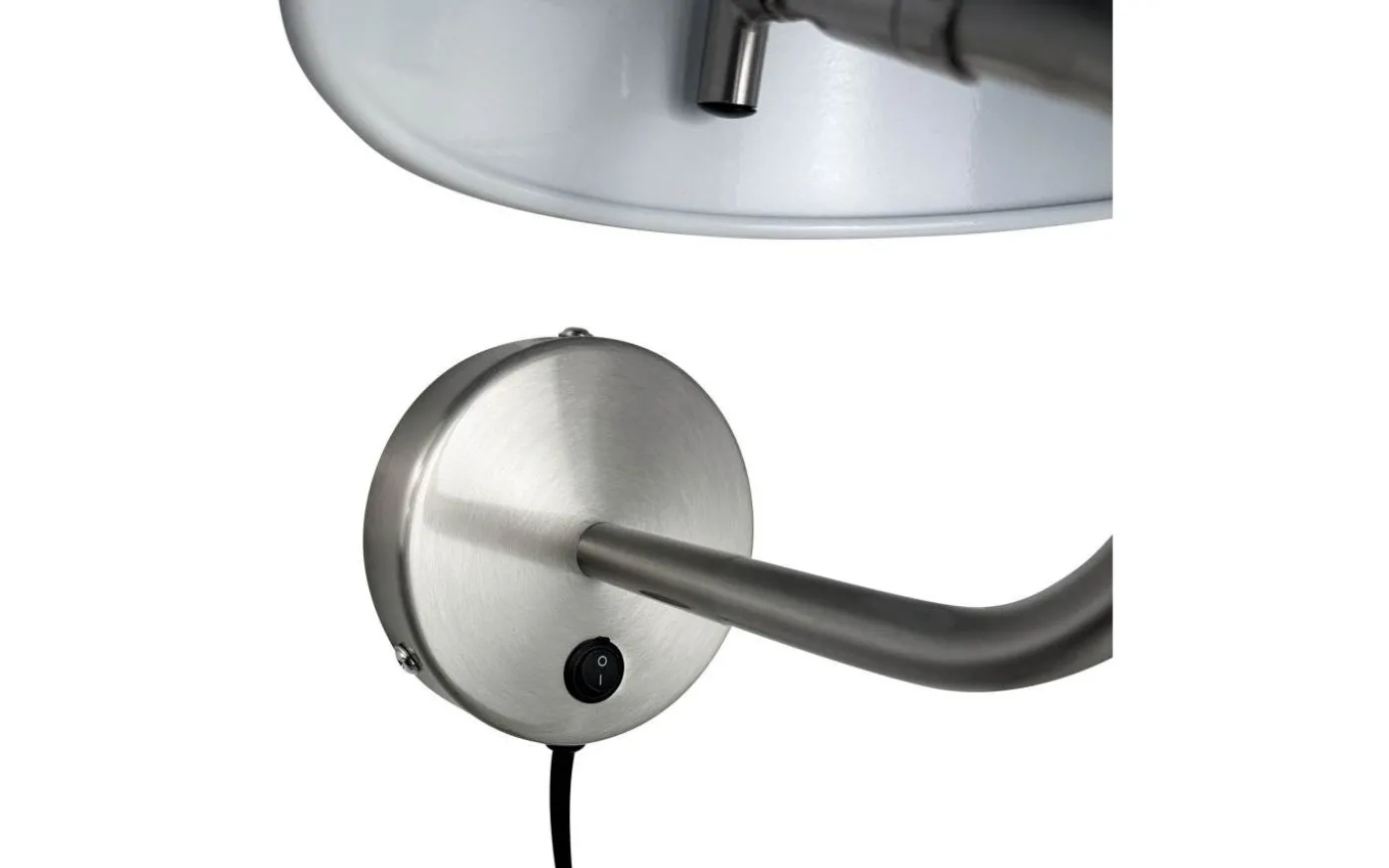 Vägglampa med metallskärm och yta i borstad stål. Skärmen kan lutas och vridas. Slå på och av på basen. Löstagbar sladd.