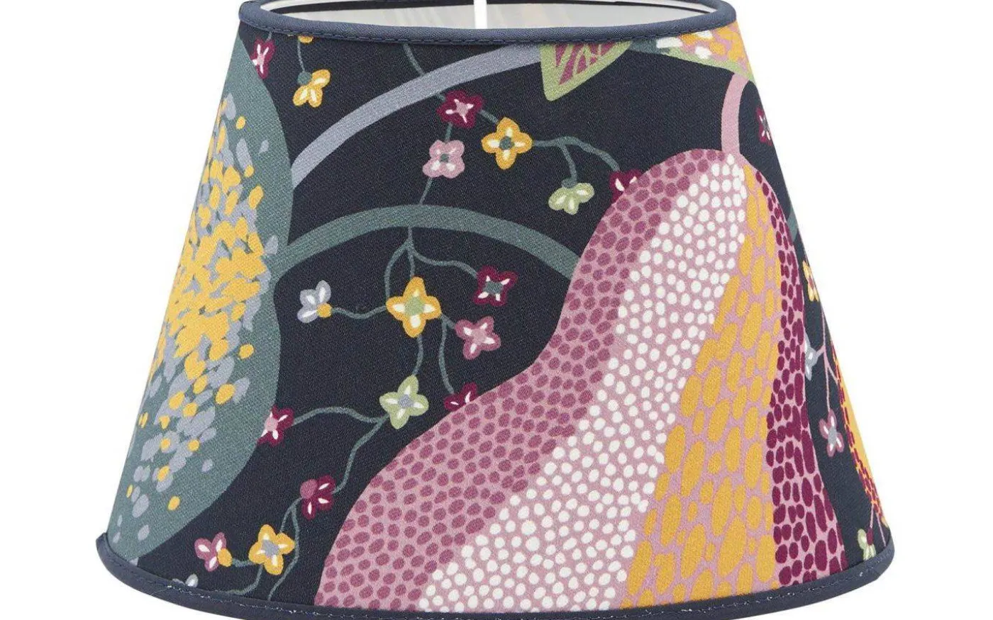 Oval lampskärm, från välkända PR Home, är i bomullstyg med ett härligt mönster med en mörkblå bakgrund som omges av massa färggladda blommor, blad, stjälkar mm.