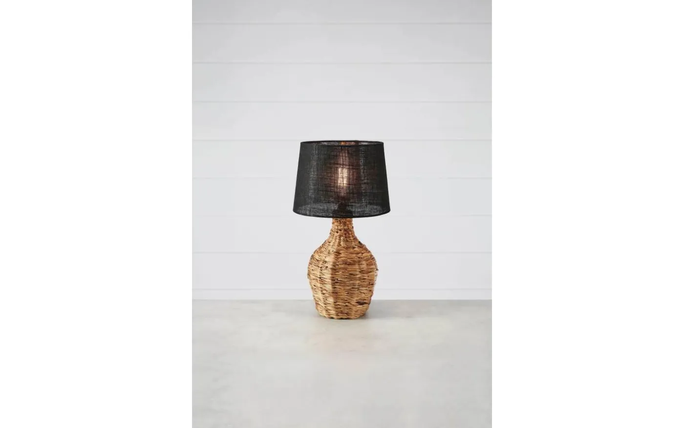 Bordslampa i rustik stil med en rejäl lampfot i naturfärgad, flätad rottin g. Det naturnära materialvalet och lampfotens organiska form skänker en varm och välkomnande känsla i rummet. Skärm i svart jute som släpper igenom ett behagligt sken. Lampan är 58 cm hög och mäter 32 cm i diameter. Finns även med vit skärm.