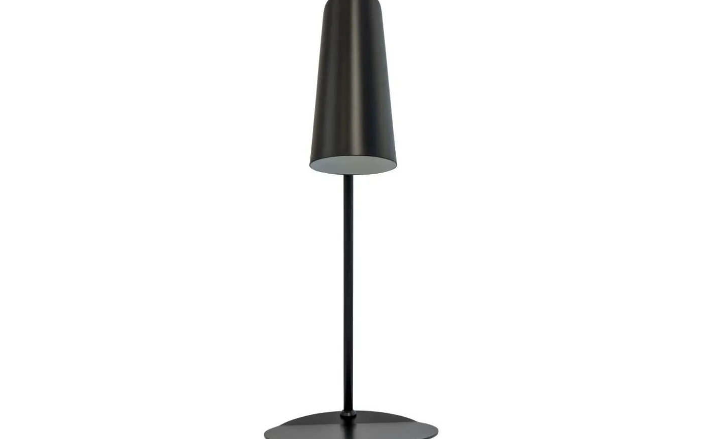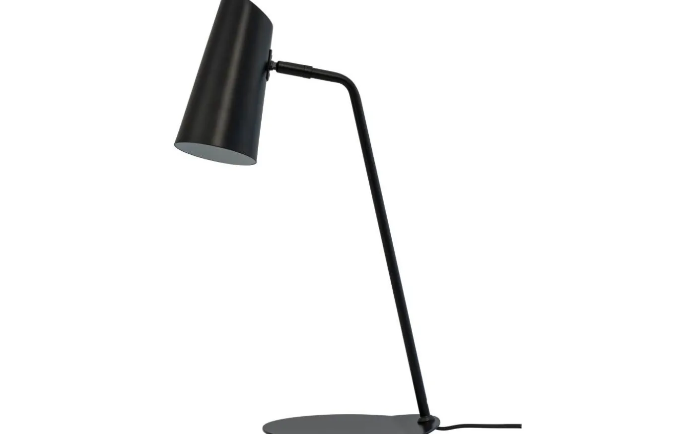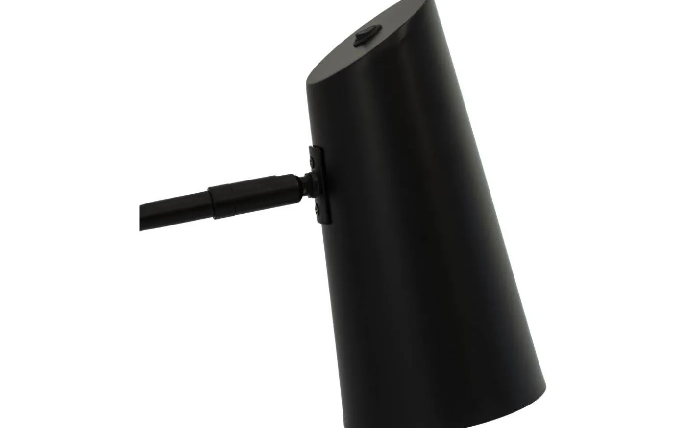 Bordslampa i metall, med on/off placerad på skärmen. Sned vinkel på basen, skärmen kan roteras och lutas.