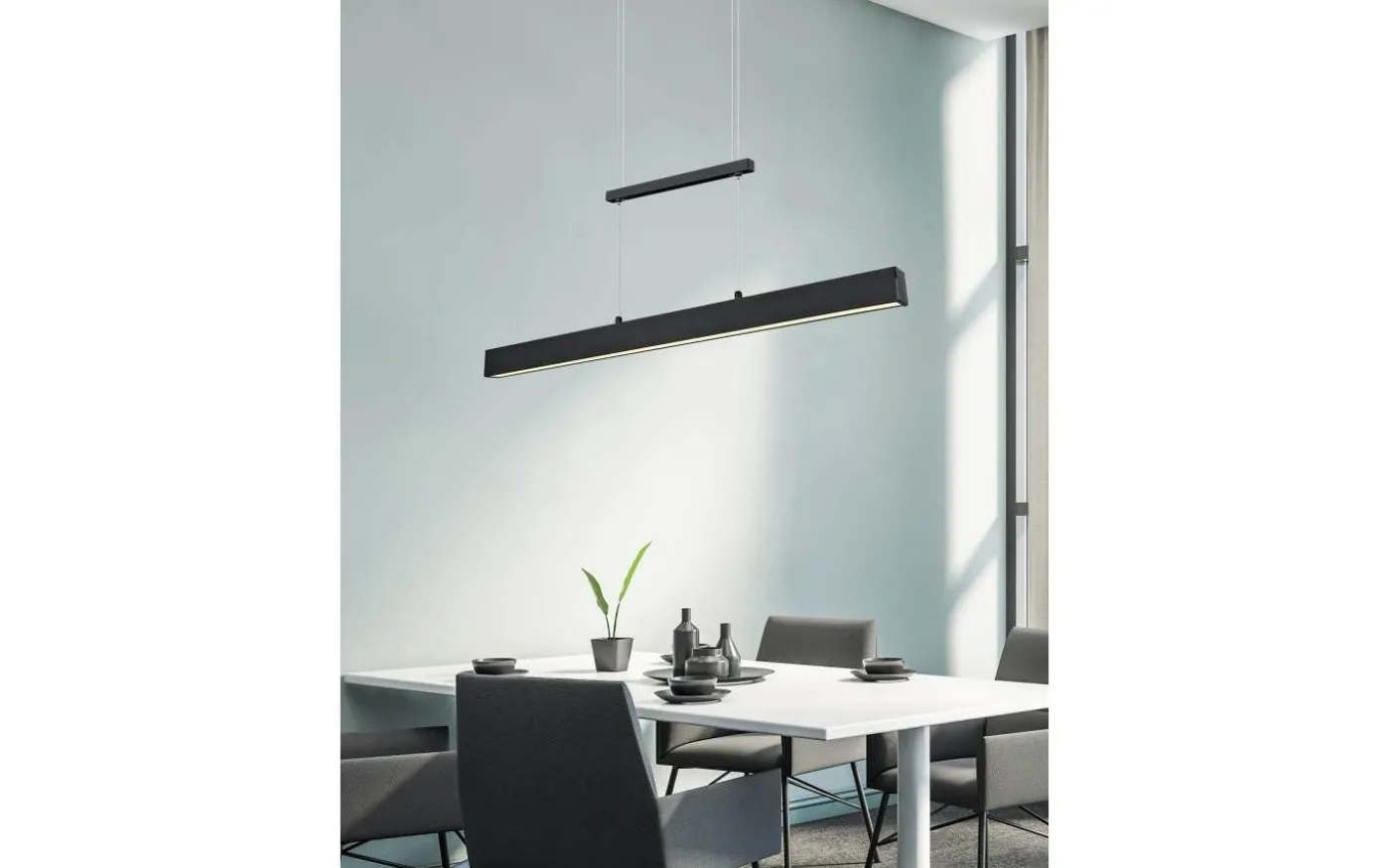 Med den puristiskt designade pendellampan PAROS framträder upp- och nerbelysningen och skapar en särskilt mysig ljusatmosfär. Höjden på den moderna lampan kan ändras när som helst genom att helt enkelt trycka upp eller ner den. Oavsett om det är för arbete, spelkvällar med vänner eller middag – de olika inställningarna ger perfekta förutsättningar för att skapa rätt ljusstämning. Tack vare den integrerade SWITCH-dimmern kan du koppla av på kvällen med neddämpad ljusstyrka eller arbeta med full ljusstyrka (100 %, 50 % och 25 %). PAROS i mattsvart har ett modernt utseende och kan enkelt integreras i alla interiörer. Dessutom har armaturerna modern LED-teknik, vilket står för hög ljuskvalitet. LED-ljuskällor kännetecknas av lång livslängd och låg värmeutveckling. Ljuskälla: inklusive 1x SMD LED, 22W · 1x 2500lm, 3000K. Ljuskälla: 2 st inklusive 2x SMD LED, 5,5W · 2x 600lm, 3000K. Extra information: Justerbar höjd, Takmontering, Ej lämplig för extern dimmer, Dimbar via strömbrytare, Upp- och nedbelysning