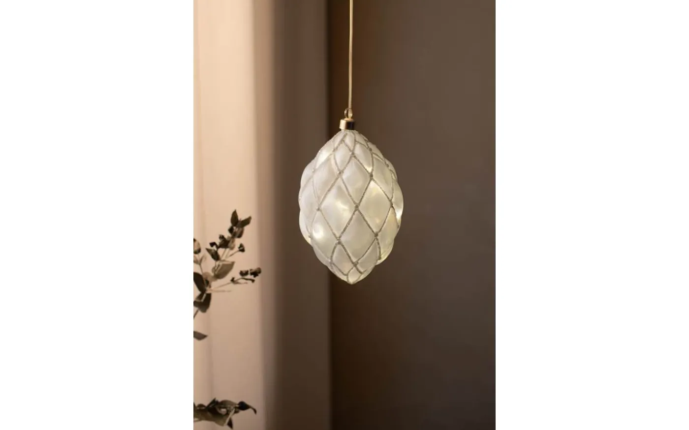 Pearl från Markslöjd är en batteridriven hängande dekoration i vitt glas. Inuti glaset ligger en slinga med 20st små ljuspunkter som lyser upp det vita glaset med ett härligt varmt ljussken.