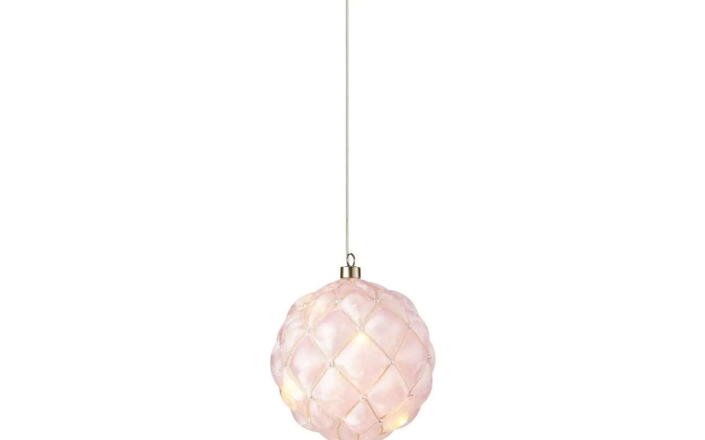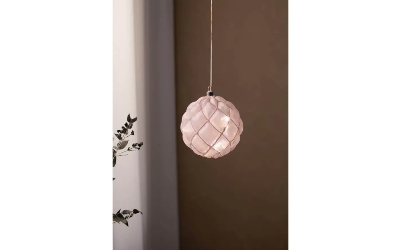 Pearl från Markslöjd är en batteridriven hängande dekoration i rosafärgat glas. Inuti glaset ligger en slinga med 20st små ljuspunkter som lyser upp det vita glaset med ett härligt varmt ljussken.